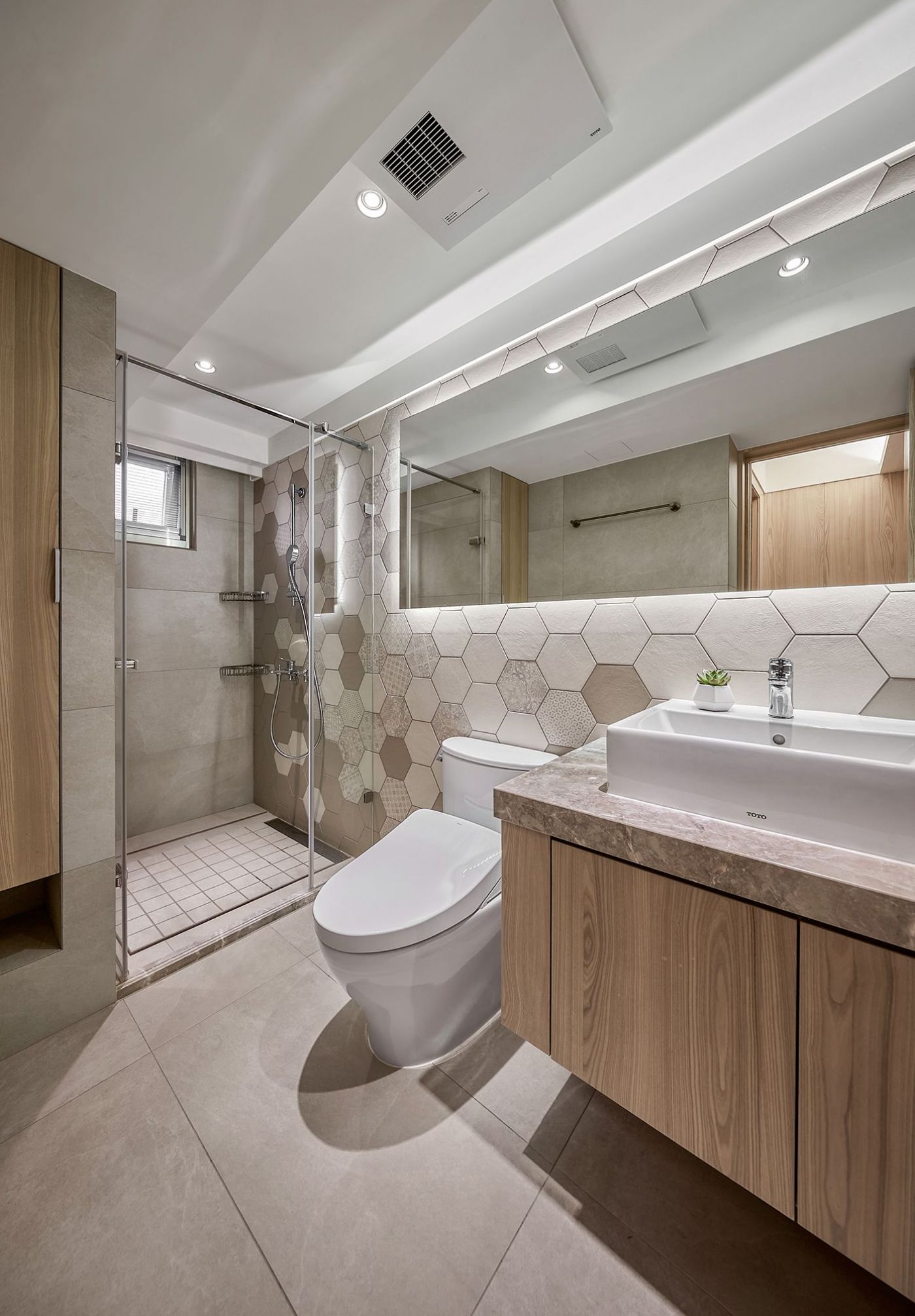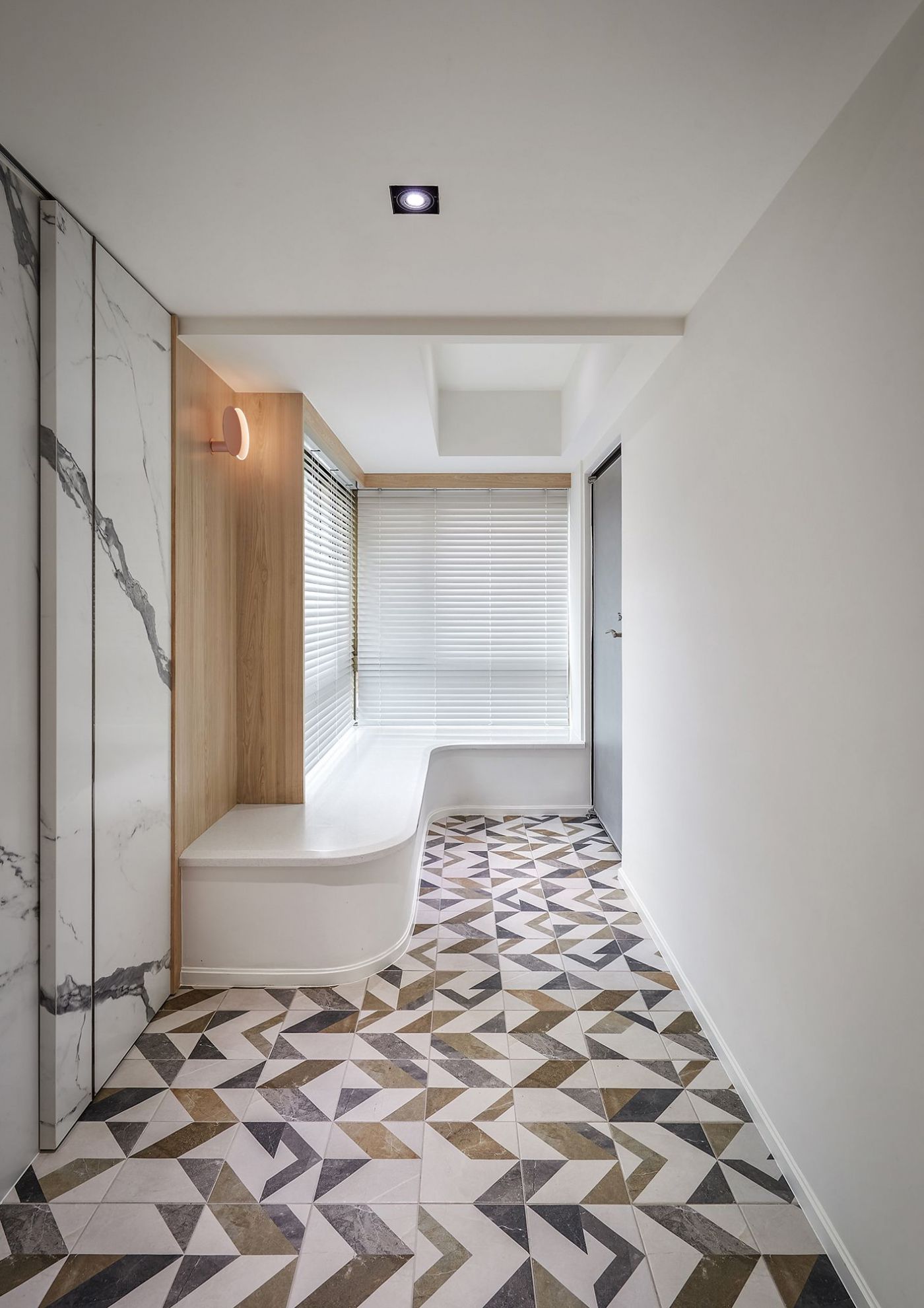 玄關落塵區地面幾何圖形花磚與孩浴牆面的六角形花磚,美式鄉村風的元素也是女主人的最愛!