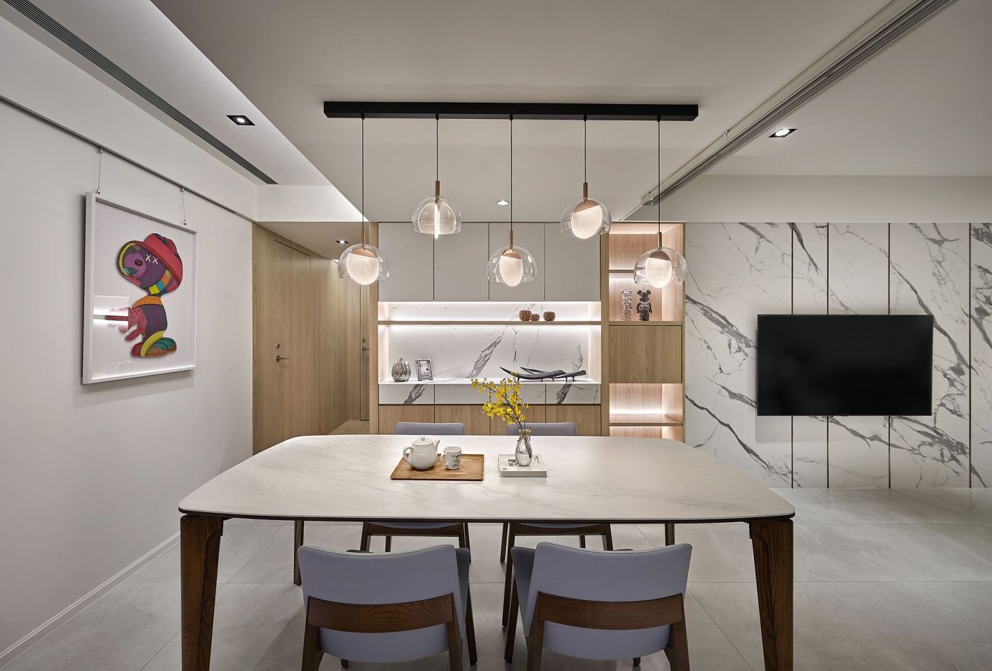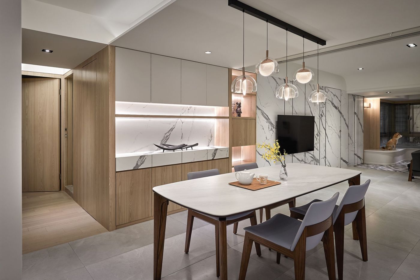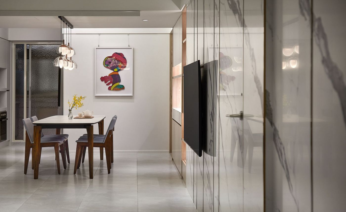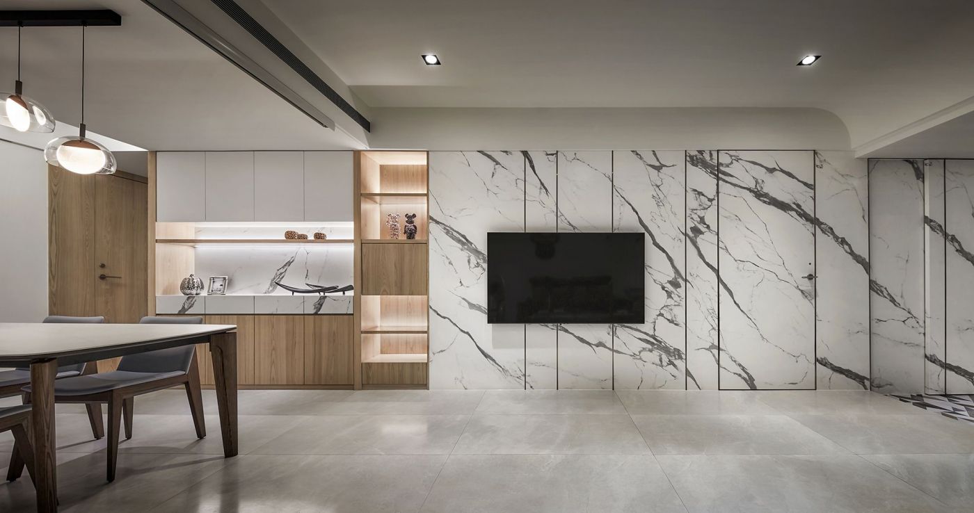通透的客廳採用白色石紋大版磚,由玄關一路延伸至餐櫃,材質統一、使用功能齊備。