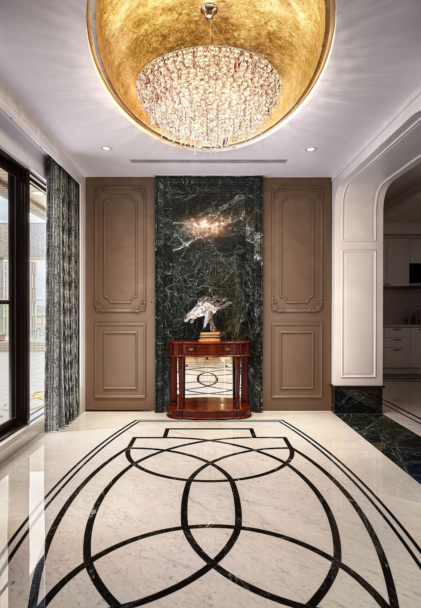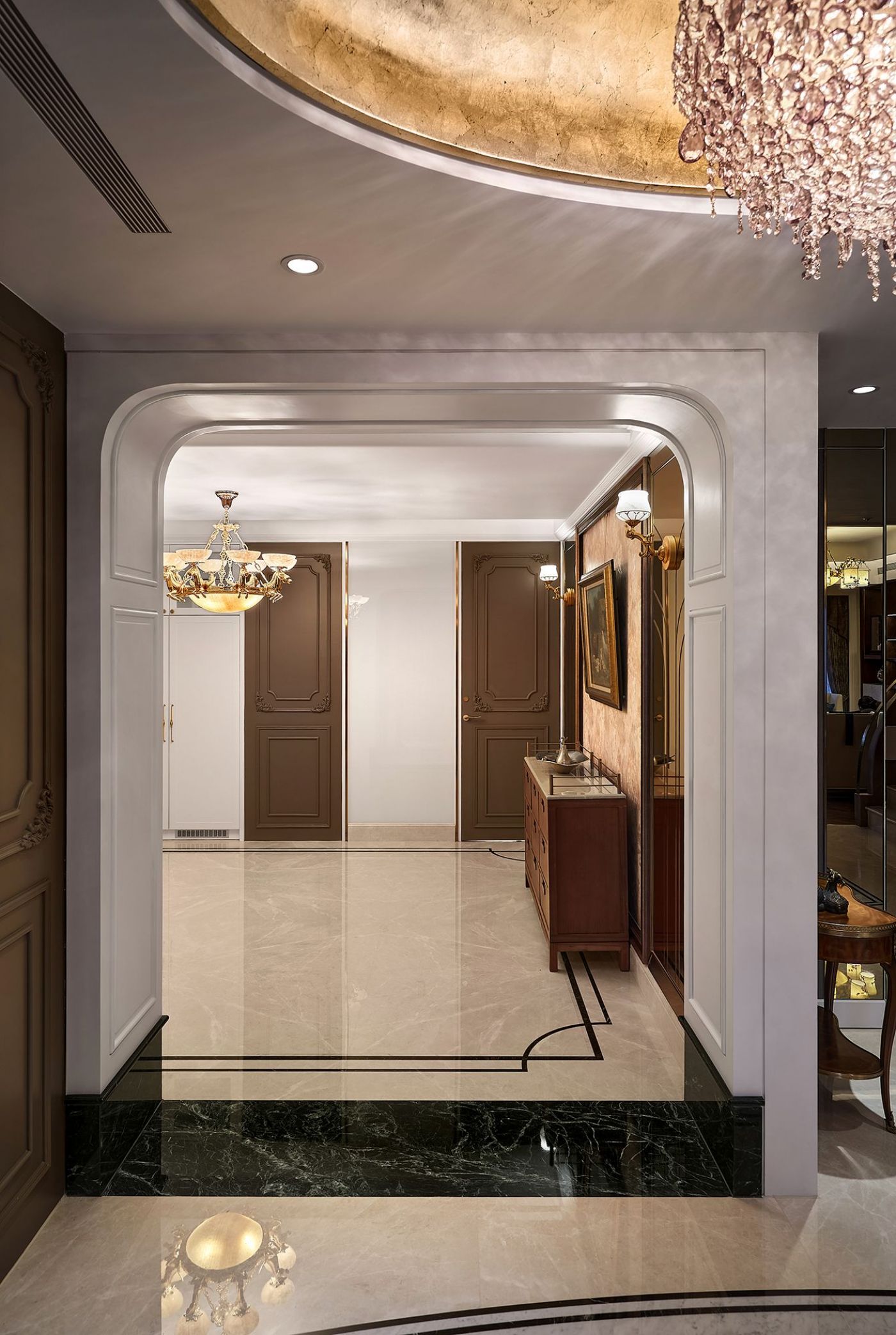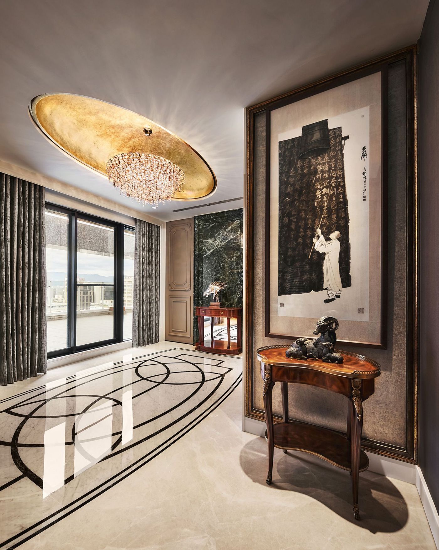 玄關的蛋形天花,表面貼附金箔搭配進口水晶燈,將質感與榮耀盡顯於此。