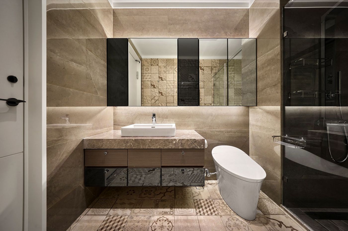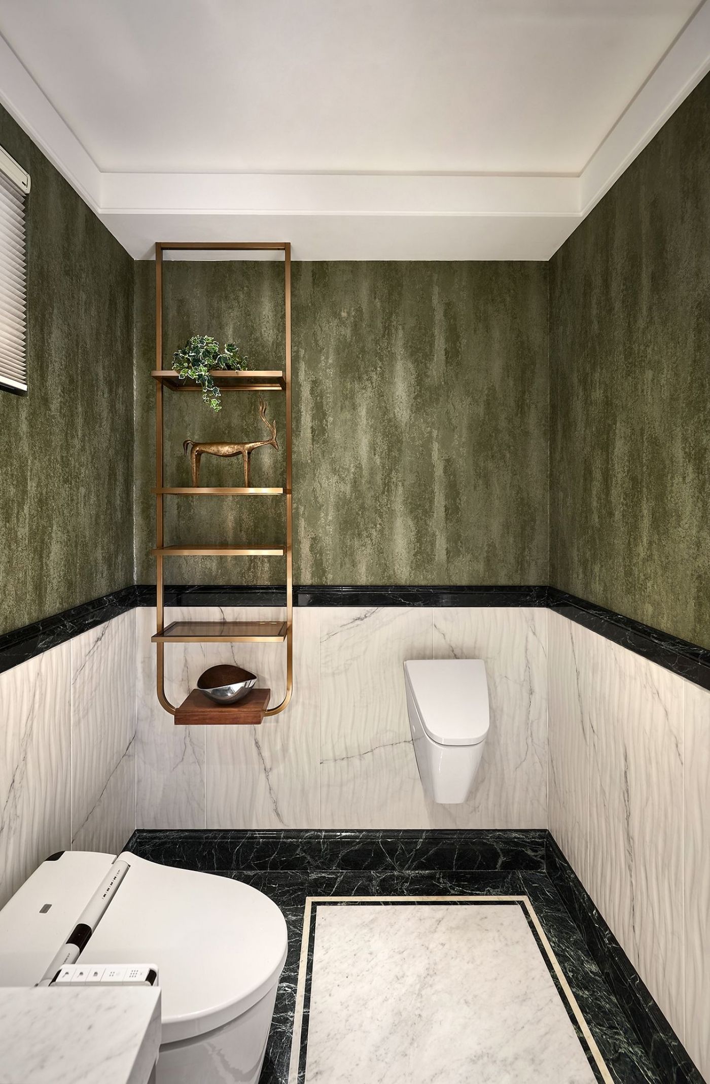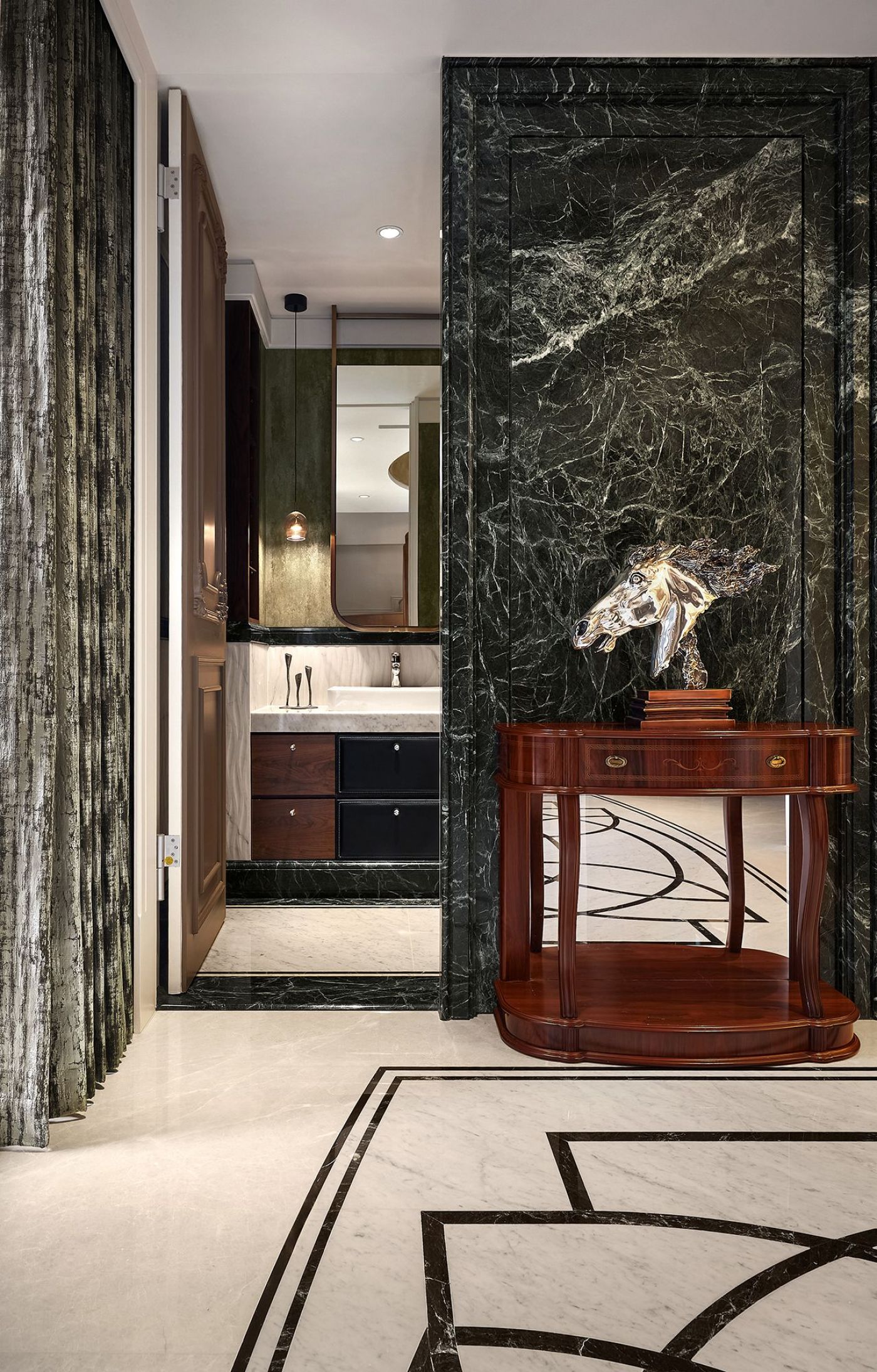 室內材質選用沉穩的胡桃木色系,搭配義大利綠及白色卡拉拉大理石,沉穩大器。