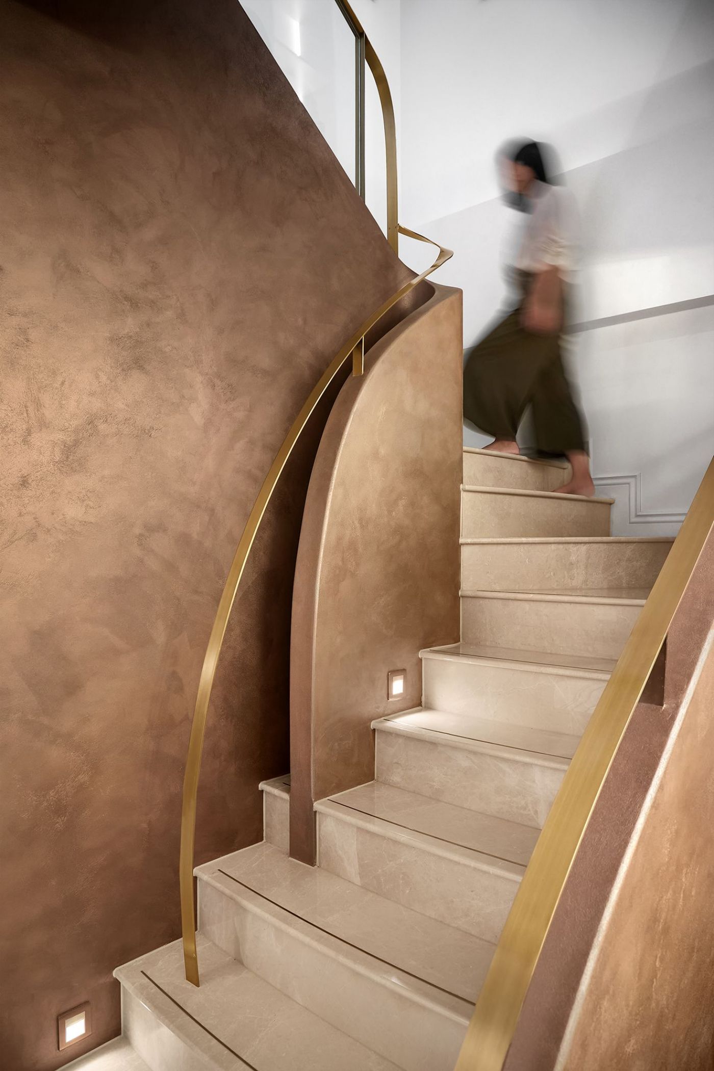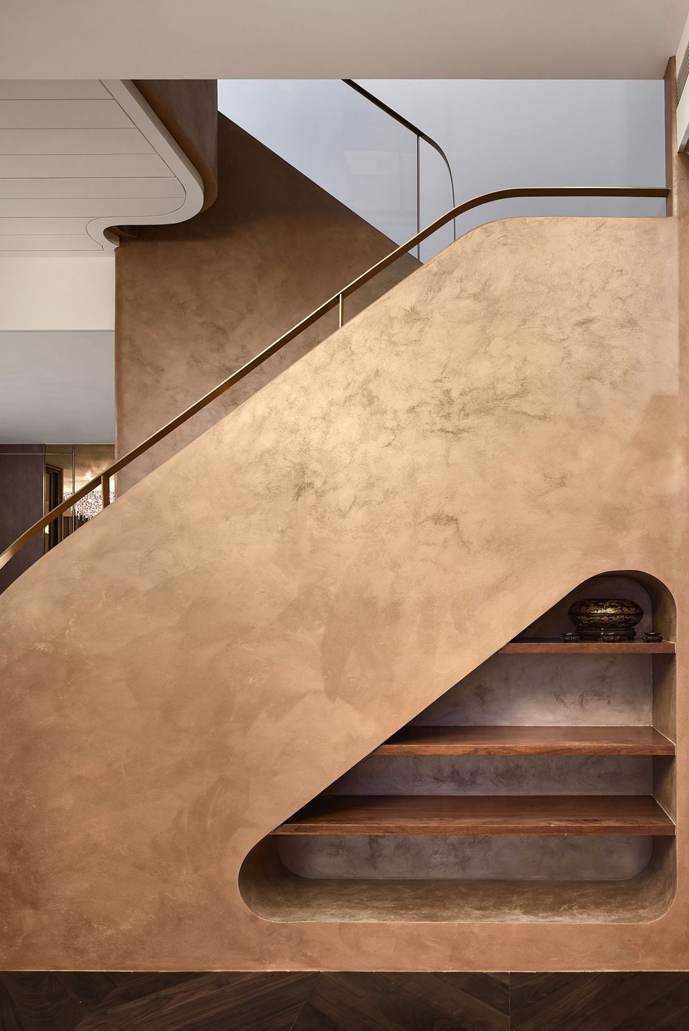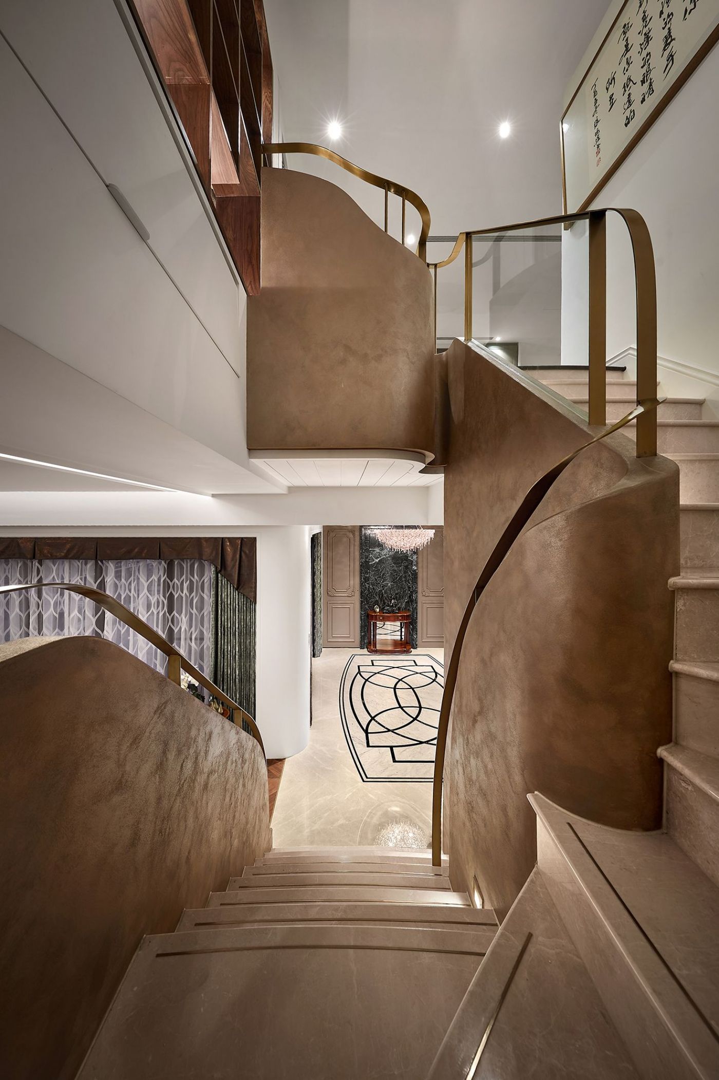 下層為公共空間包括客廳,開放式廚房,餐廳、獨立熱炒區與主臥室獨立空間,順著弧形的美麗階梯而上;