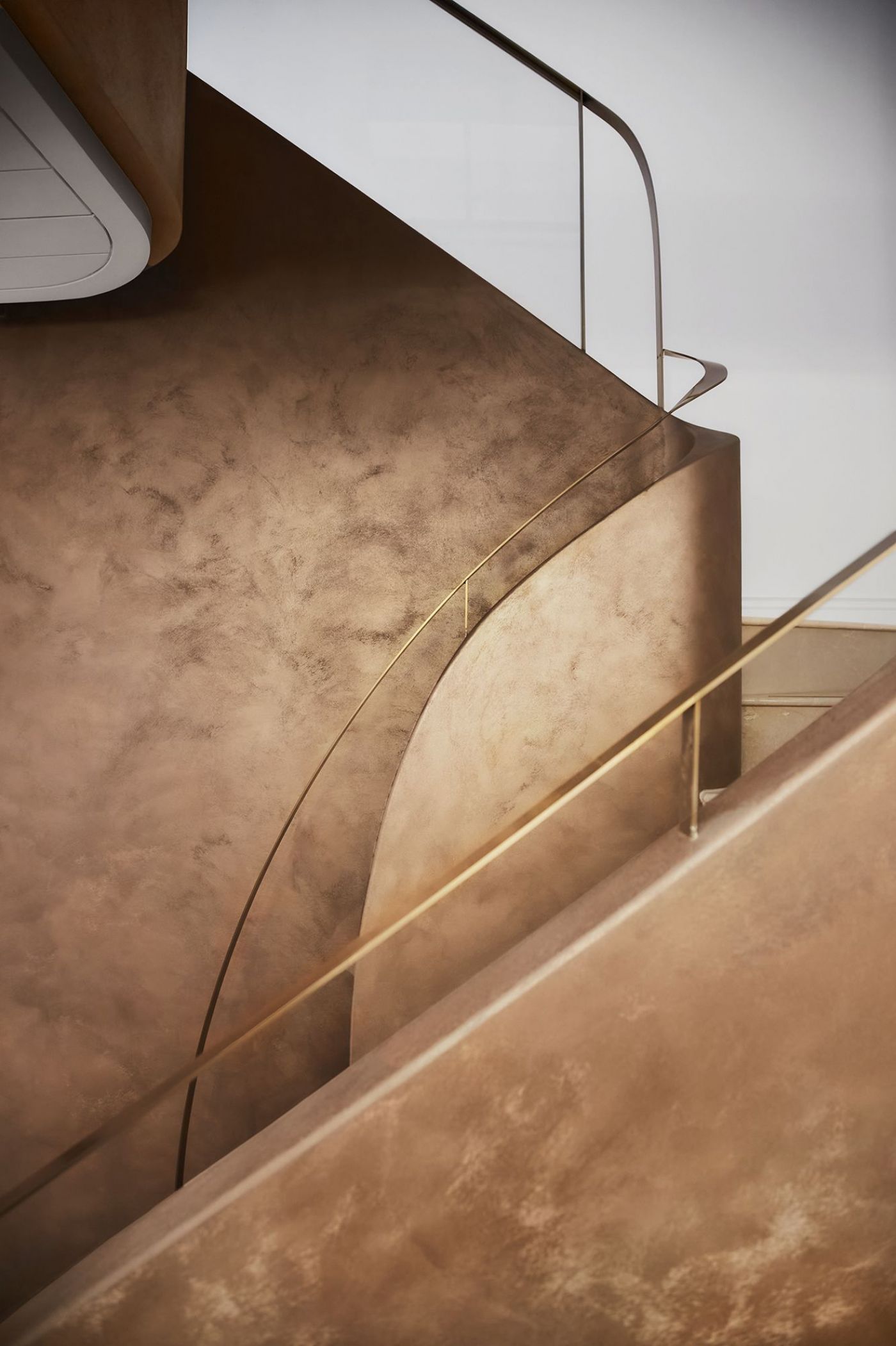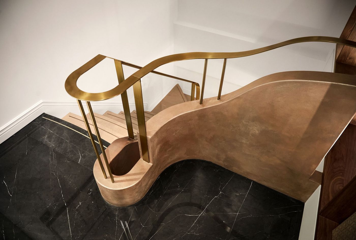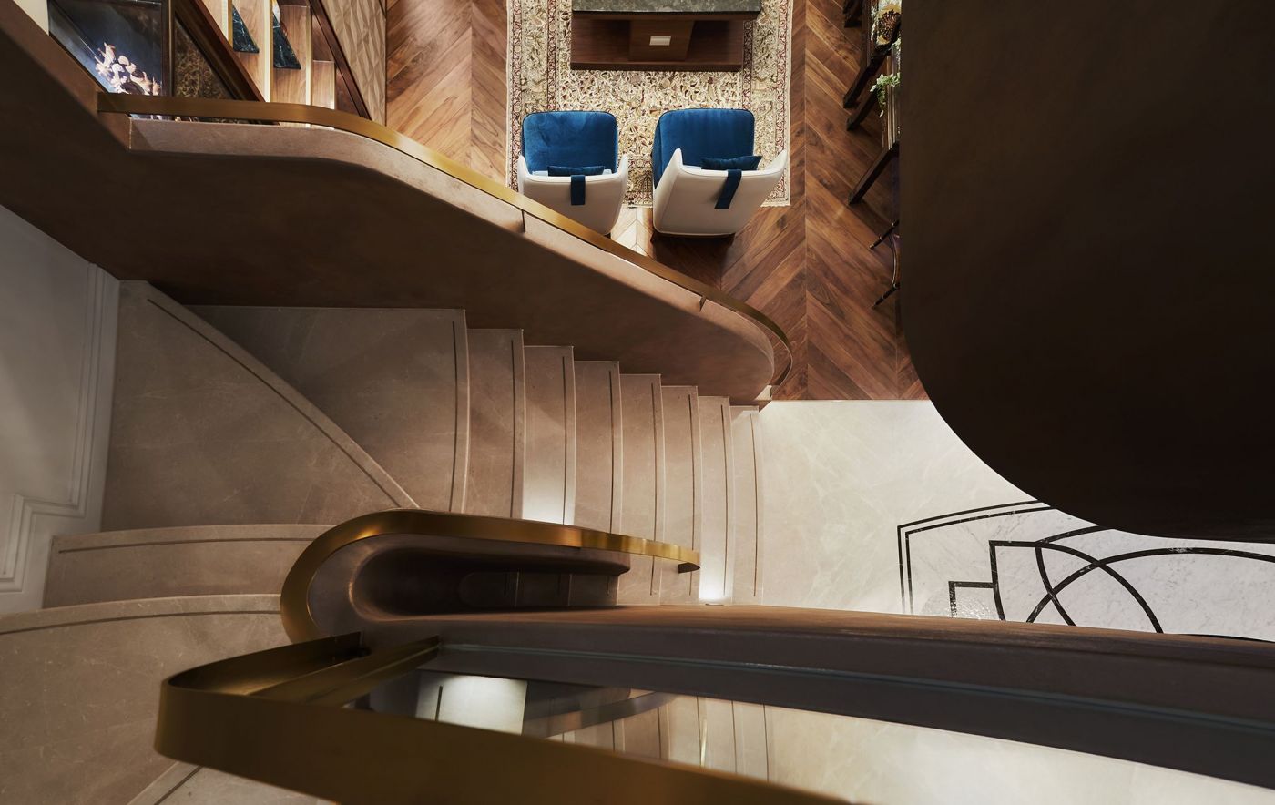 下層為公共空間包括客廳,開放式廚房,餐廳、獨立熱炒區與主臥室獨立空間,順著弧形的美麗階梯而上;