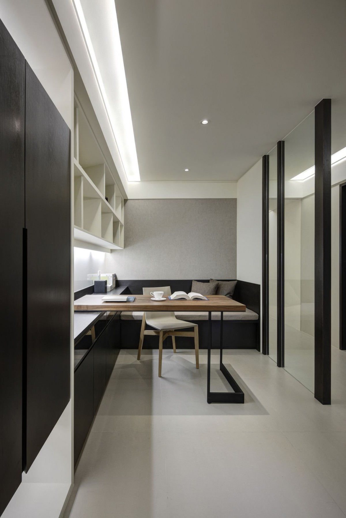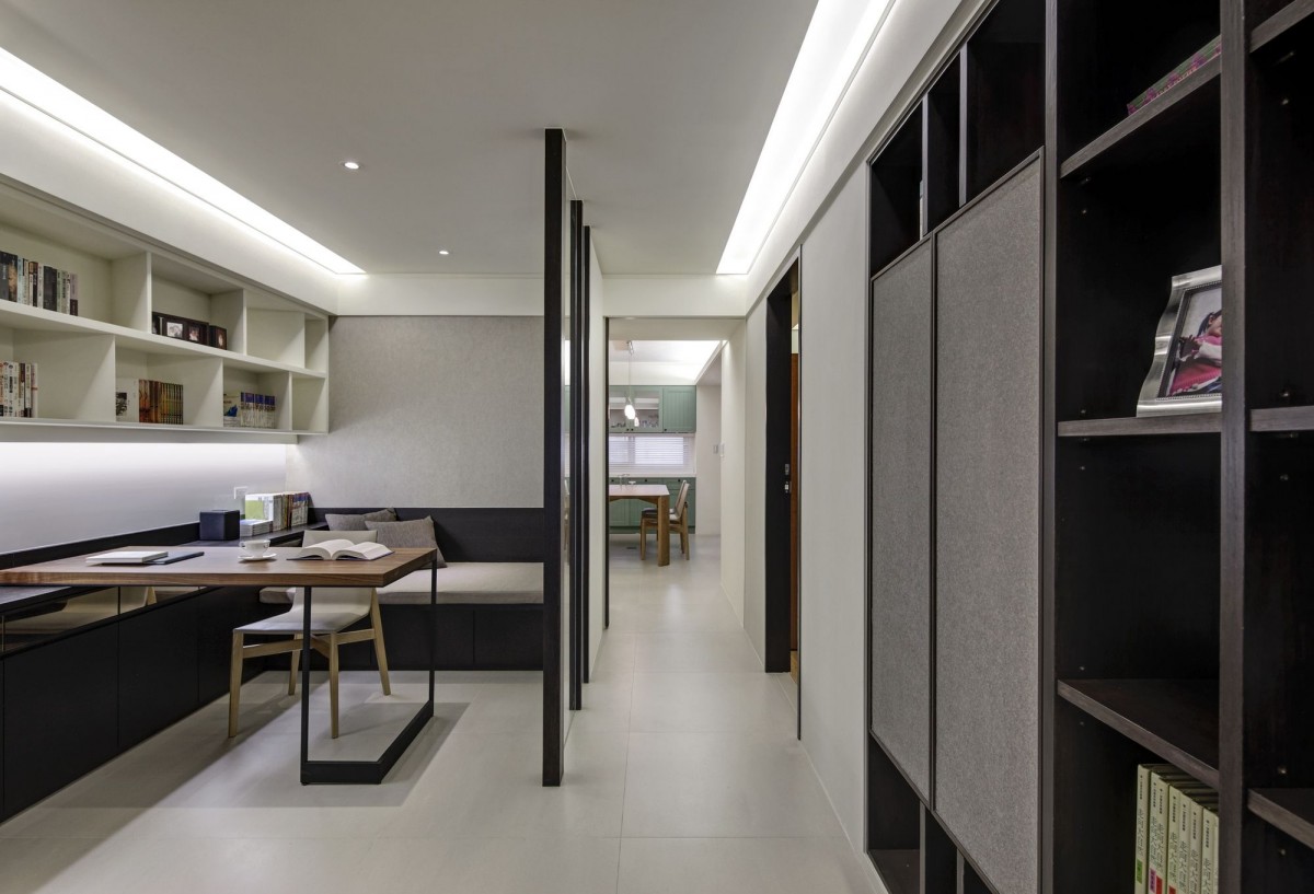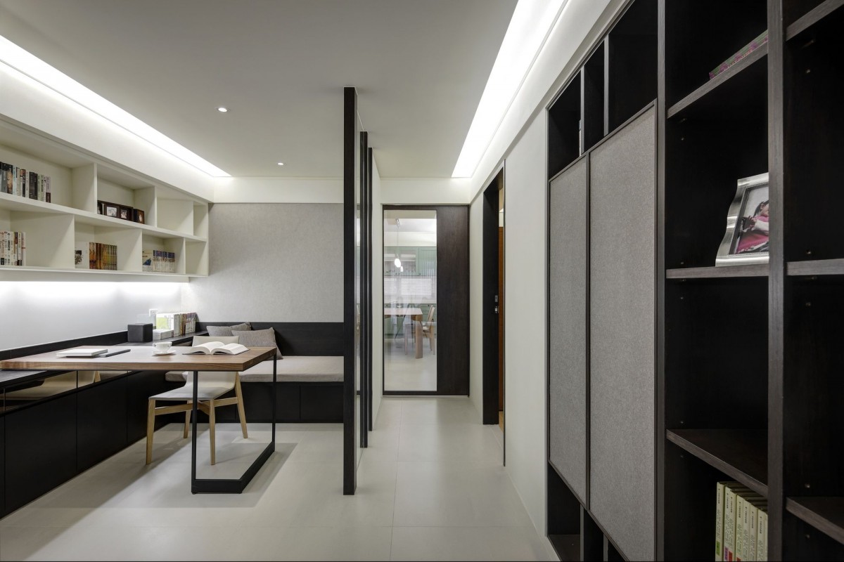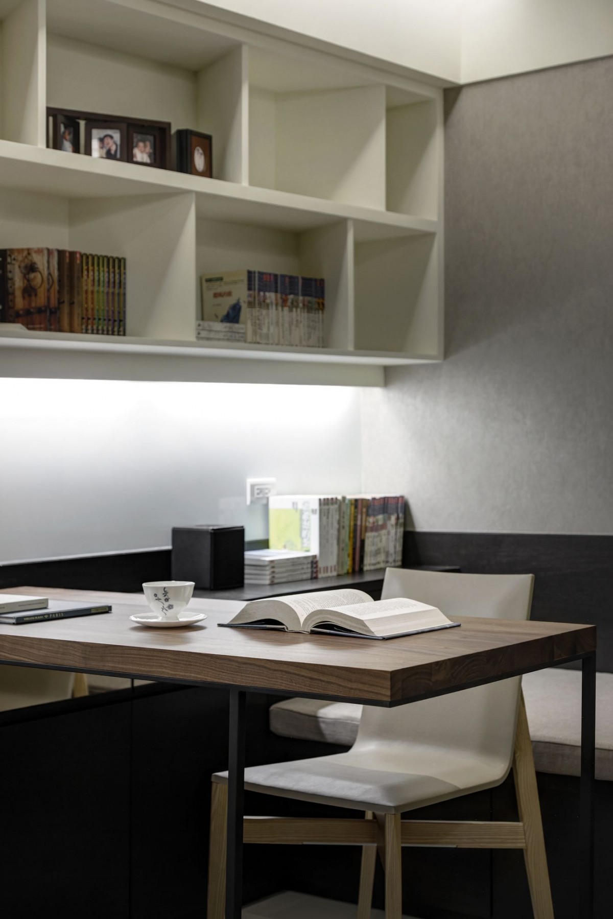 一家四口的書香家居 譜出空間的基調 讀書聲 喀喀做響鍵盤聲 在流動性十足的半開放書房 各取所需 各投所好 那些知性的 專業的 旅遊的 心靈的 展示在自由游走間隨手取得處 穿越 不再只是穿越 扮隨著腳步聲 心靈愈發成長 空間的端景 是一幅美麗的畫 畫裡有前後左右穿梭的身影 安靜埋首或讀書 或寫字 桌邊置放著黃澄澄的鮮榨柳橙汁 書香 木紋香漾成的滿室香 伴隨烤箱滴搭計時聲 在時光流轉裡凍結 框出一幅 動人的無價畫作
