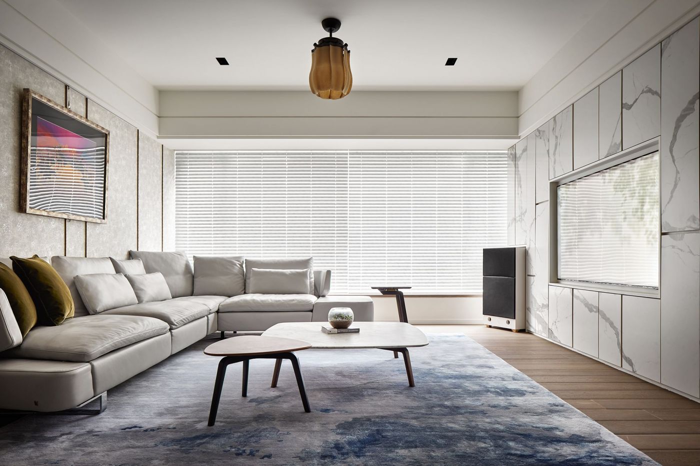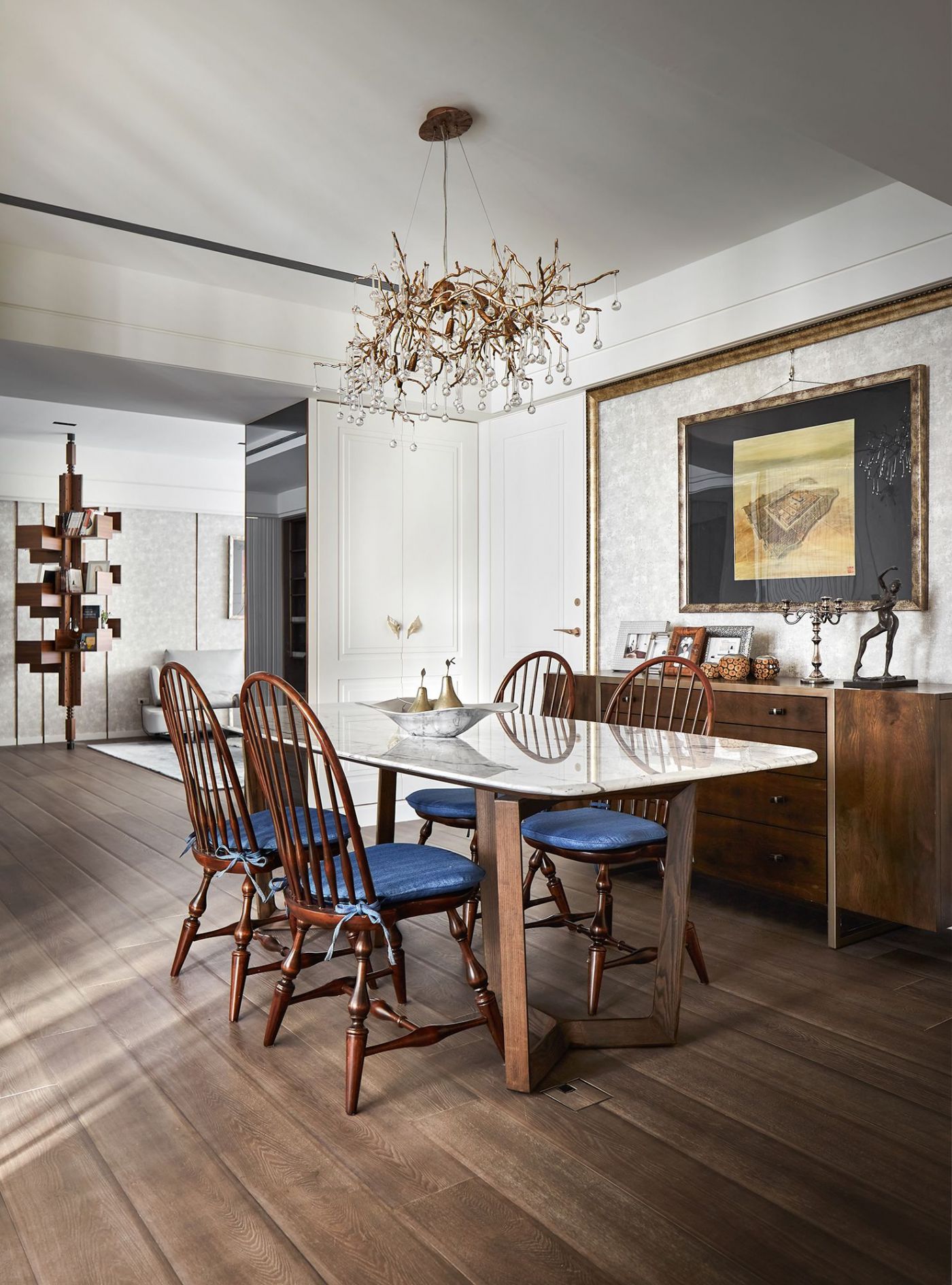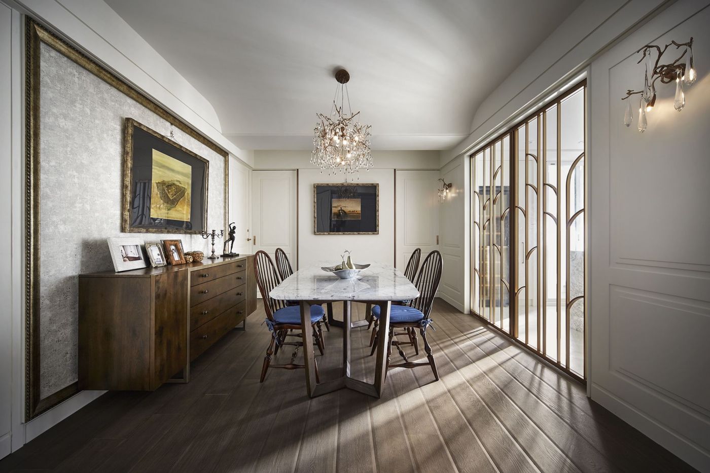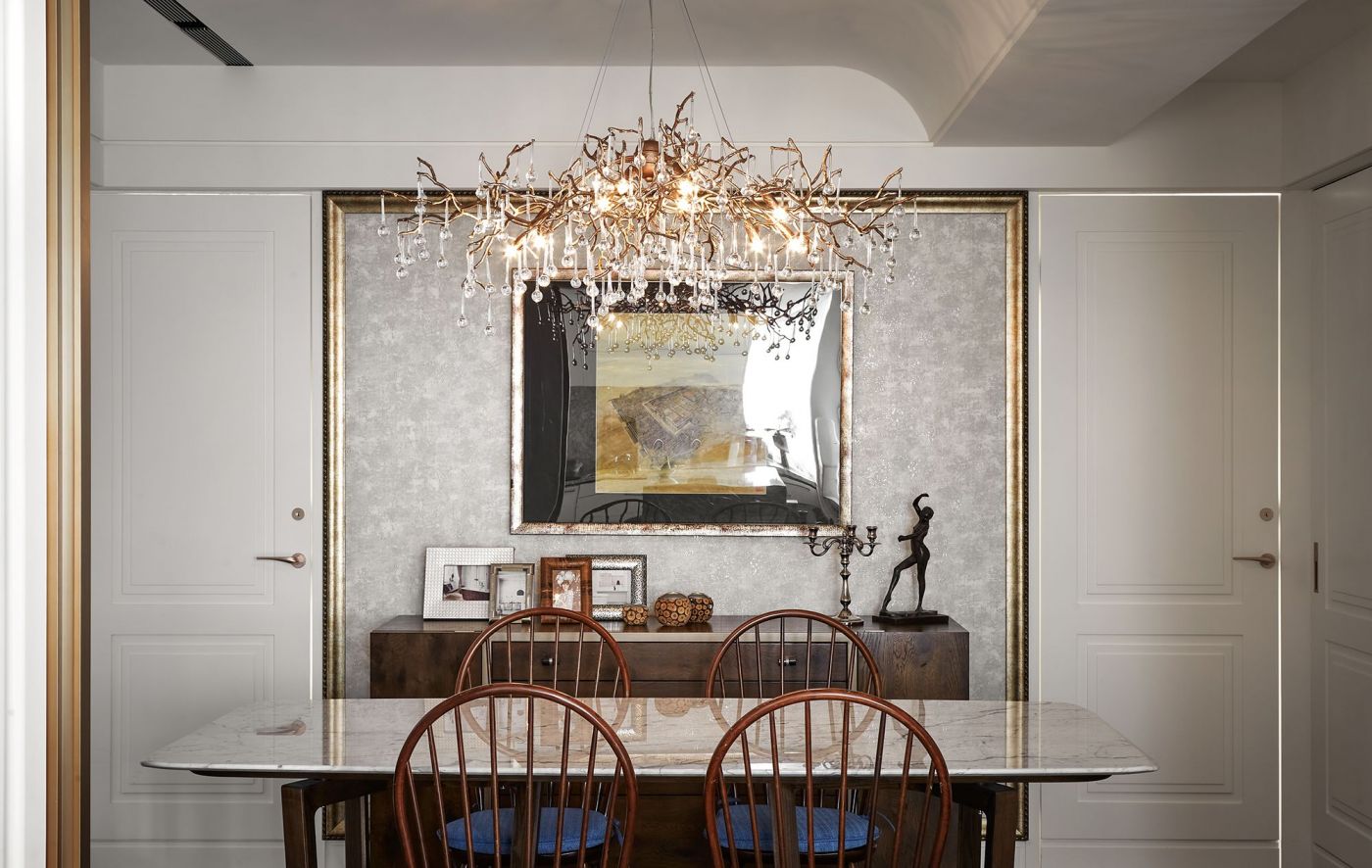 寬敞的室內空間,依著生活機能與空間動線安排就緒, 深刻烙印出主人的美式現代風, 家具、裝飾品和燈飾....客廳獨樹一格的Poltrona Frau 木製旋轉書架,搶眼無比。 沙發背牆的線條比例,與電視牆的白色石頭紋理, 相互映襯,大器非凡。 餐廳引光入室, 葡萄牙Serip古典壁燈以引領我們走入藝術殿堂的氛圍。