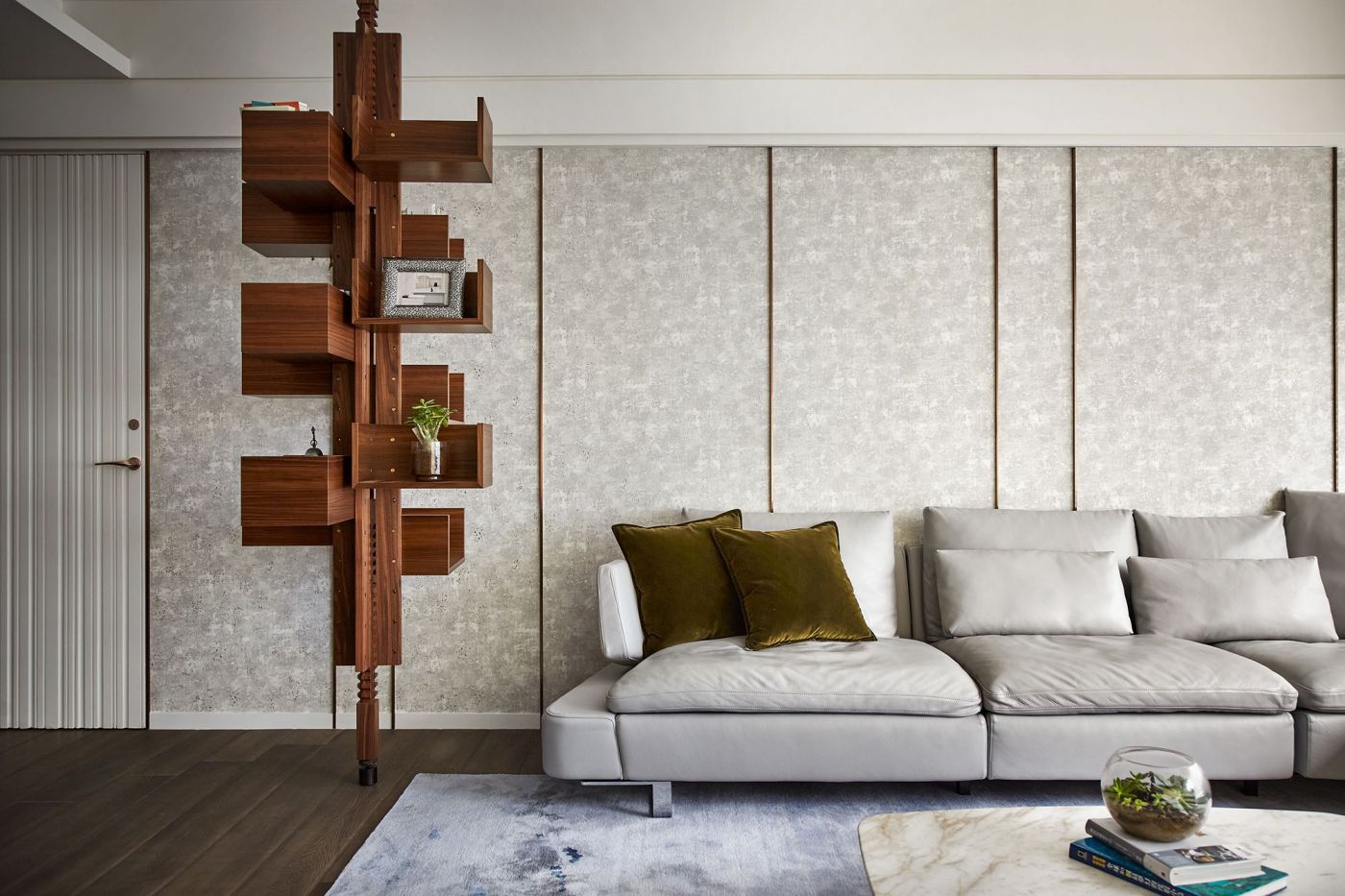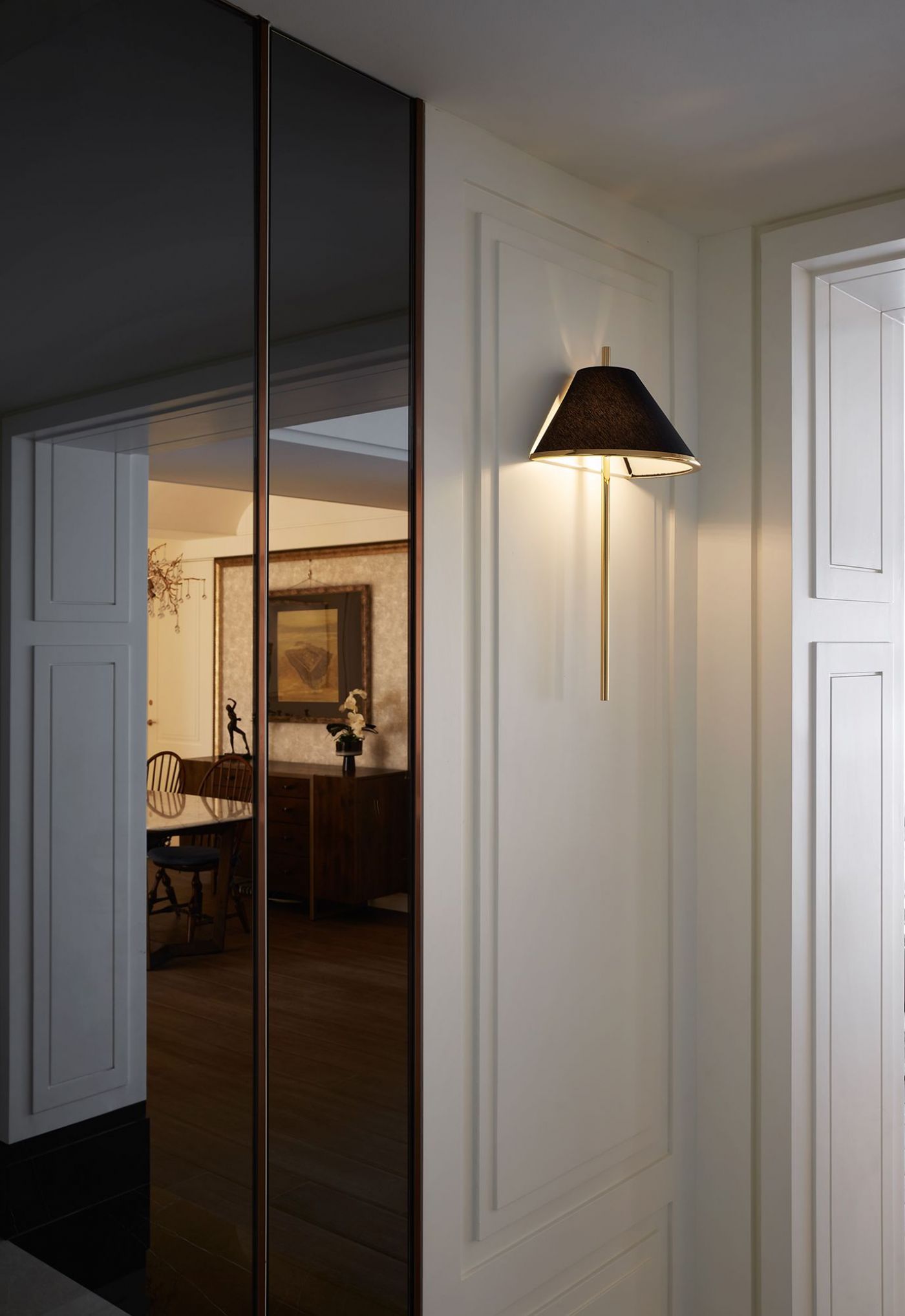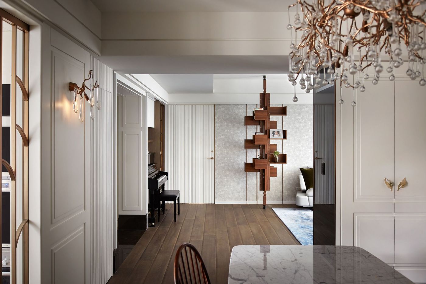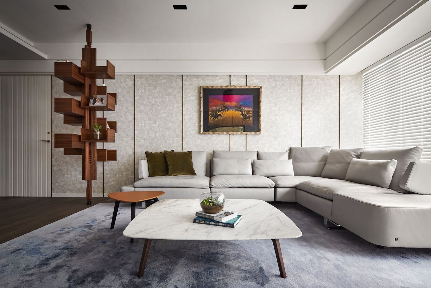 寬敞的室內空間,依著生活機能與空間動線安排就緒, 深刻烙印出主人的美式現代風, 家具、裝飾品和燈飾....客廳獨樹一格的Poltrona Frau 木製旋轉書架,搶眼無比。 沙發背牆的線條比例,與電視牆的白色石頭紋理, 相互映襯,大器非凡。 餐廳引光入室, 葡萄牙Serip古典壁燈以引領我們走入藝術殿堂的氛圍。