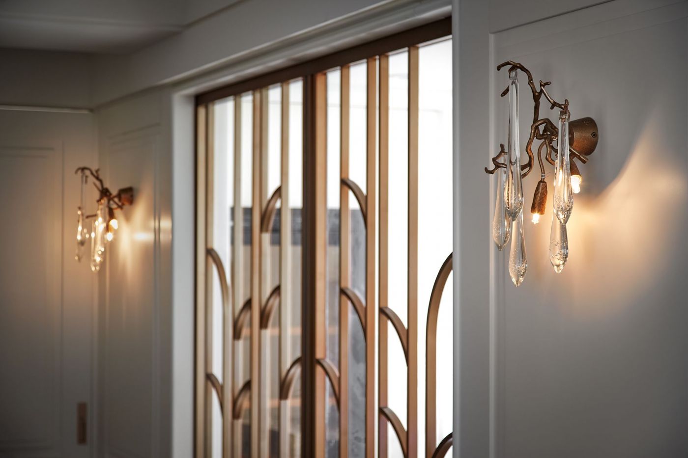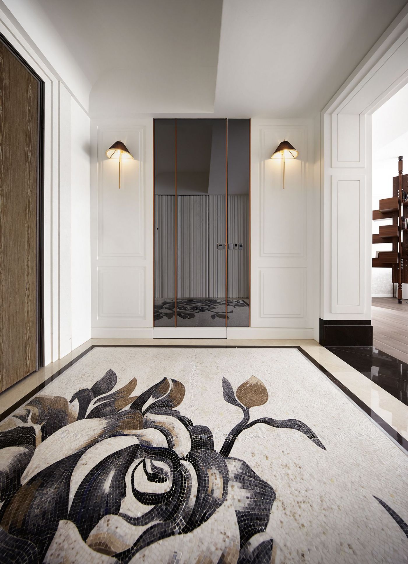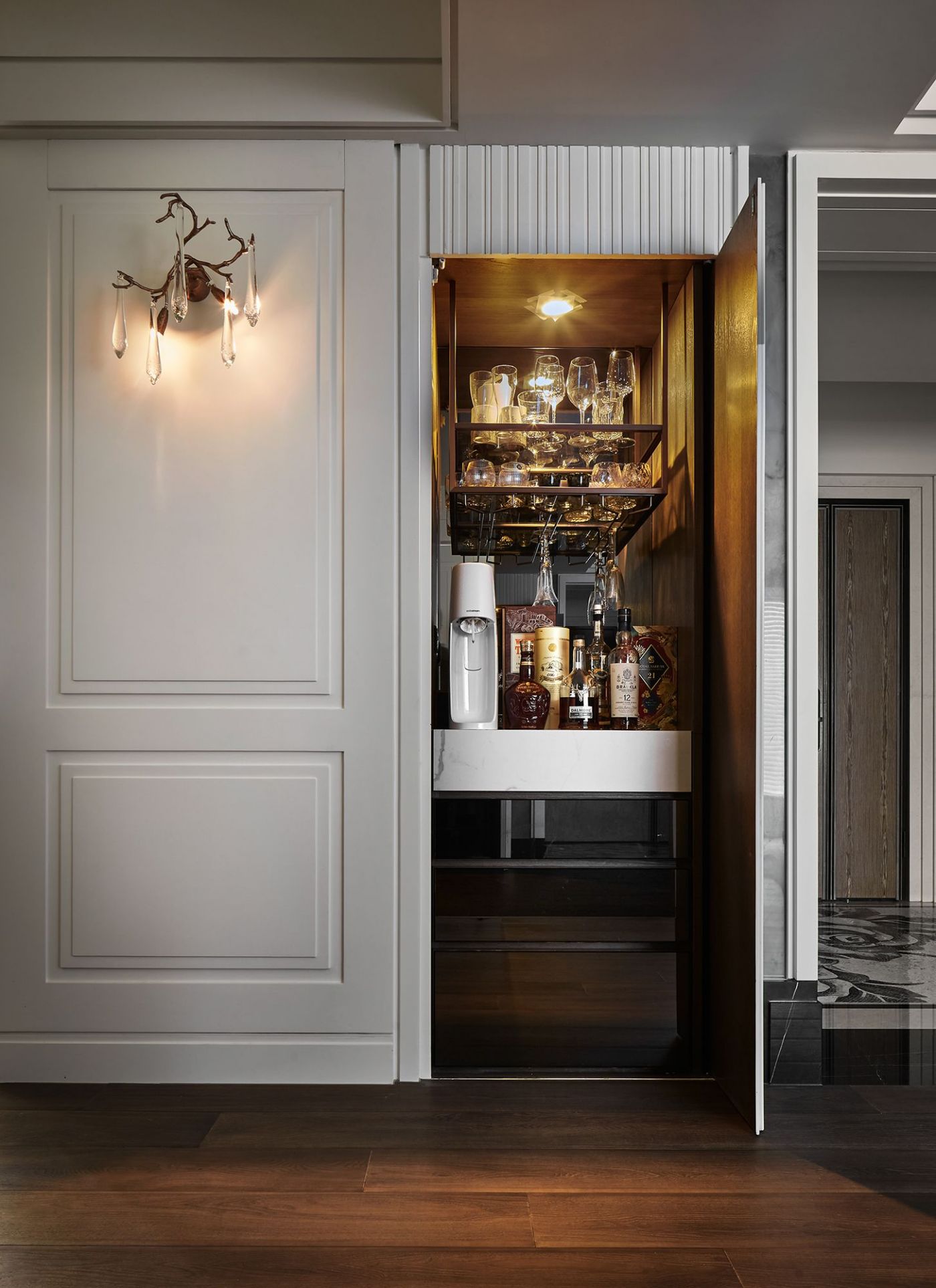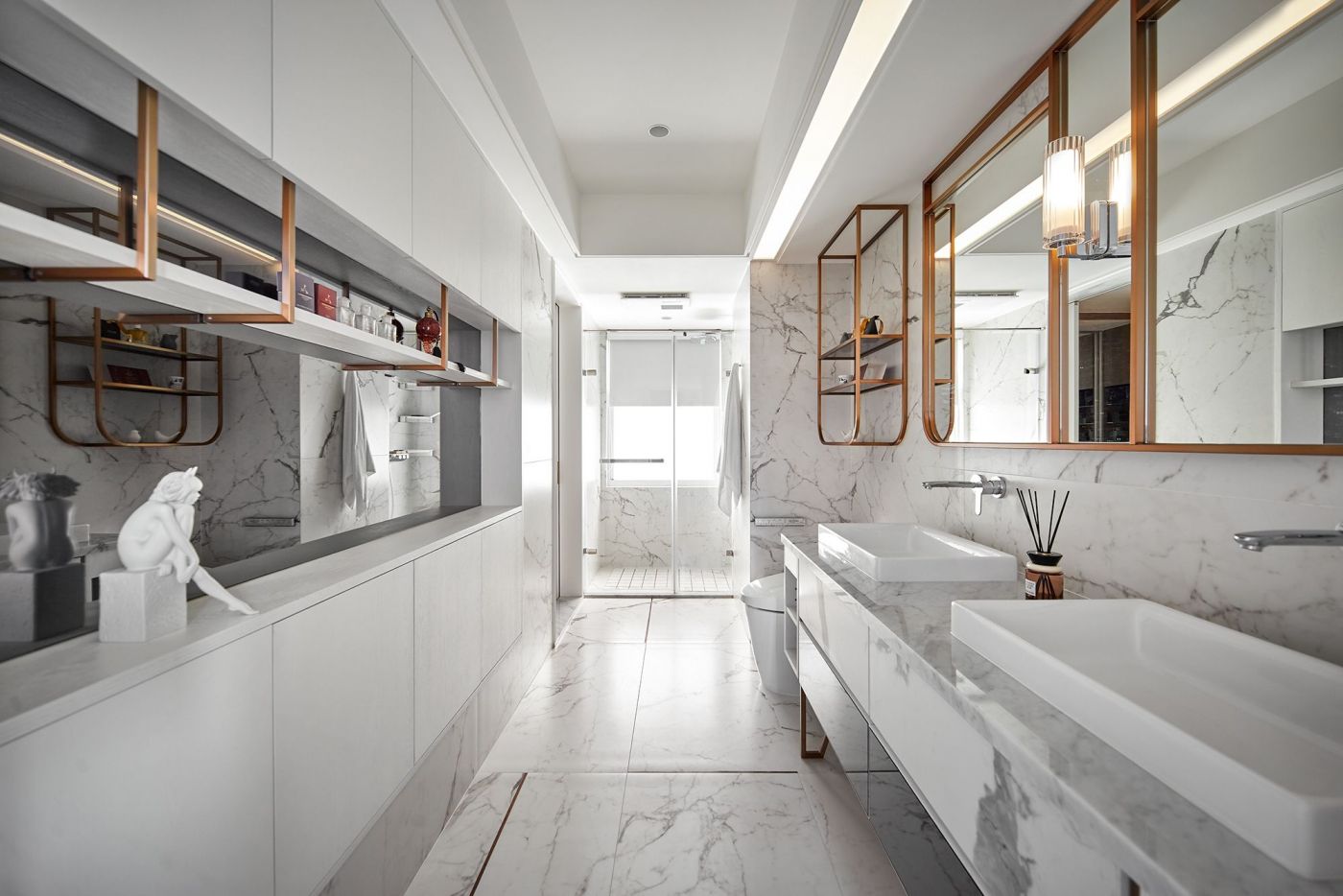 寬敞的室內空間,依著生活機能與空間動線安排就緒, 深刻烙印出主人的美式現代風, 家具、裝飾品和燈飾....客廳獨樹一格的Poltrona Frau 木製旋轉書架,搶眼無比。 沙發背牆的線條比例,與電視牆的白色石頭紋理, 相互映襯,大器非凡。 餐廳引光入室, 葡萄牙Serip古典壁燈以引領我們走入藝術殿堂的氛圍。