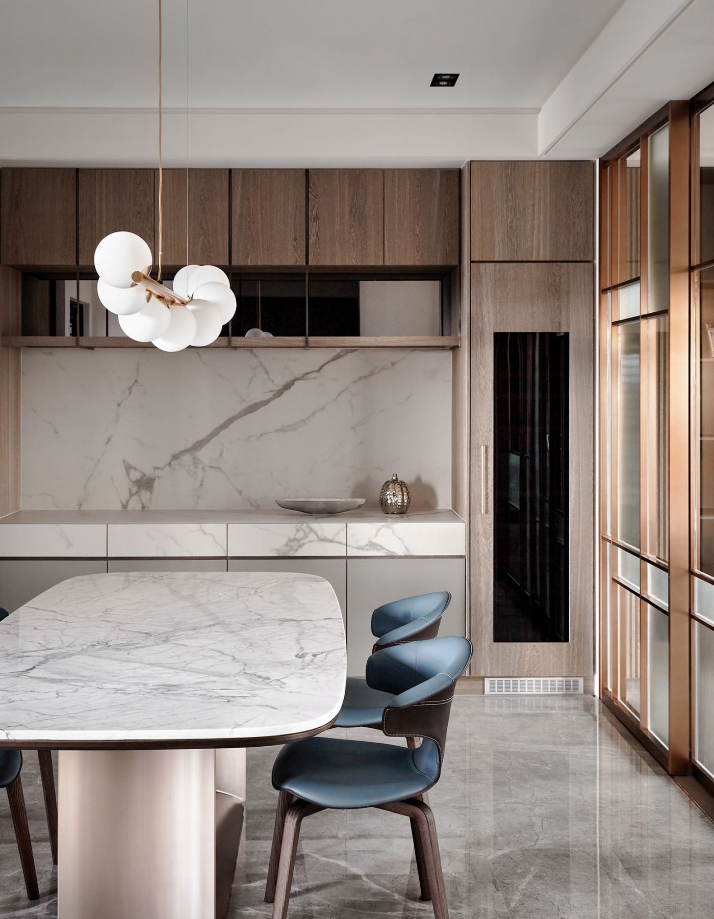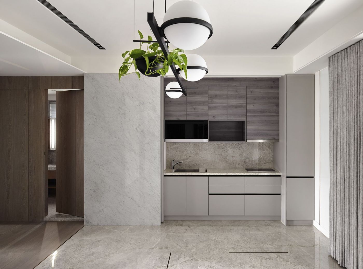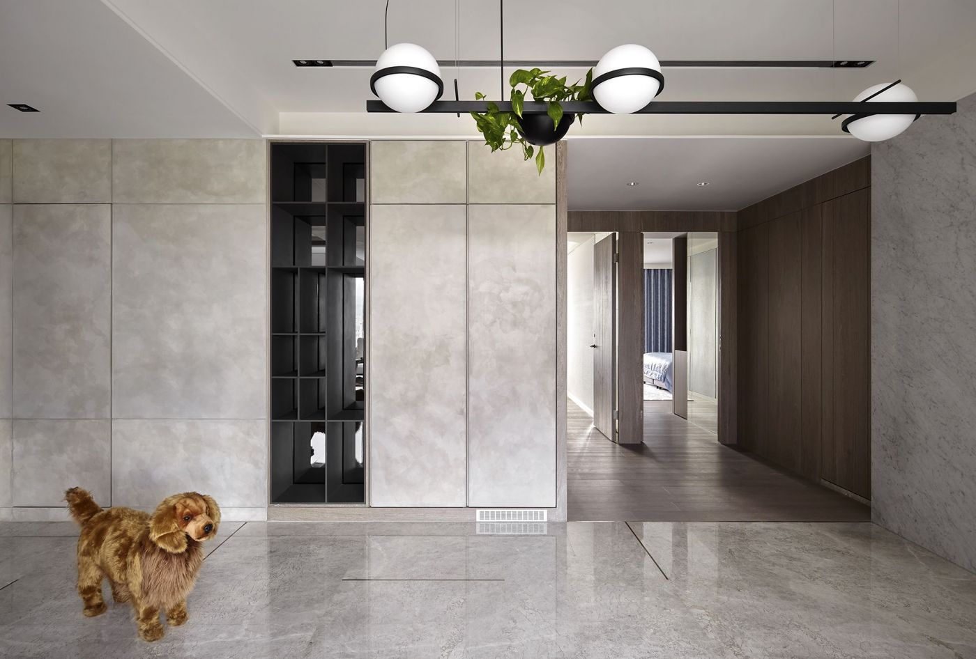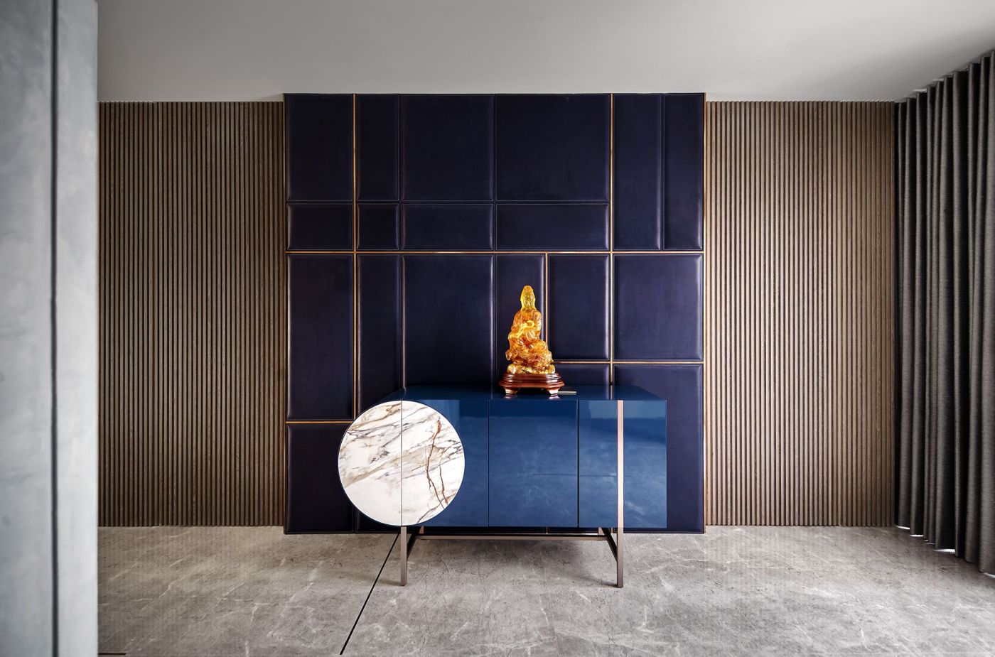 那素白的大理石,映照出若有似無的室內點景; 灰色水泥紋牆面與大理石牆對比呼應,呈現霧面與亮面的質感較勁。 帶點藝術及歷史的紋理,在嶄新的空間裡有如沉澱過的遺跡。 家具進駐前的素淨空間裡, 跟孩子一起奔跑律動、輕盈跳躍,好不快活,享受真正的"空"間感。 藍色幾何比例皮板,將視線焦點凝聚在此, 曲折的空間結構,超乎意外地帶來不一樣的空間感受!
