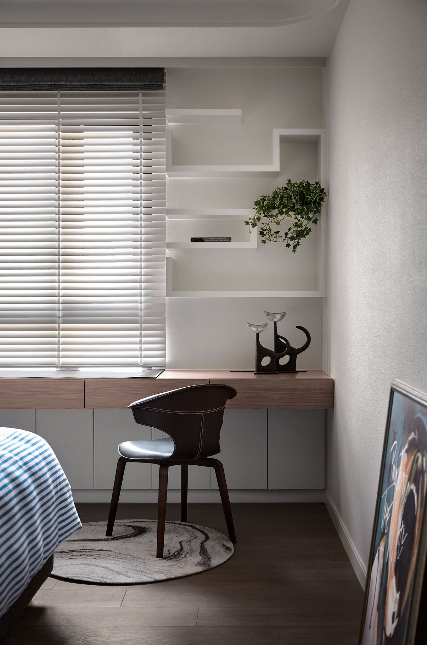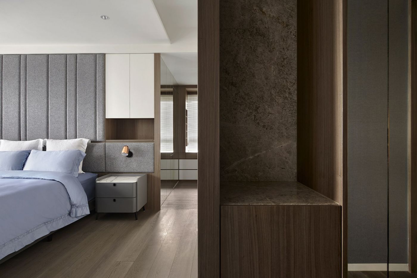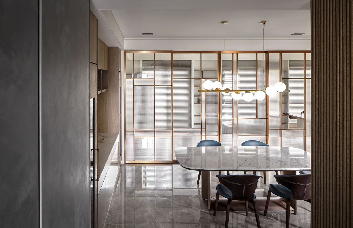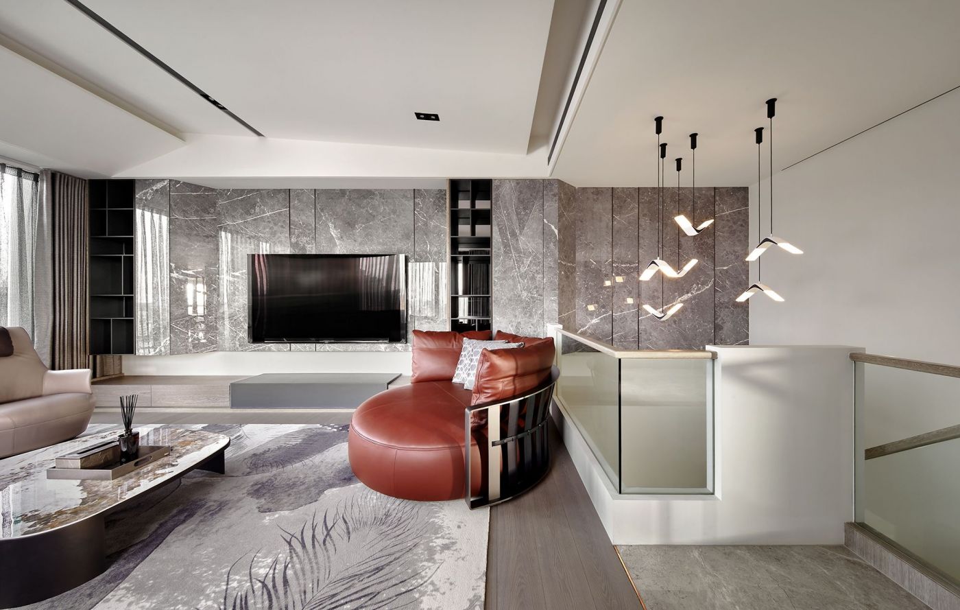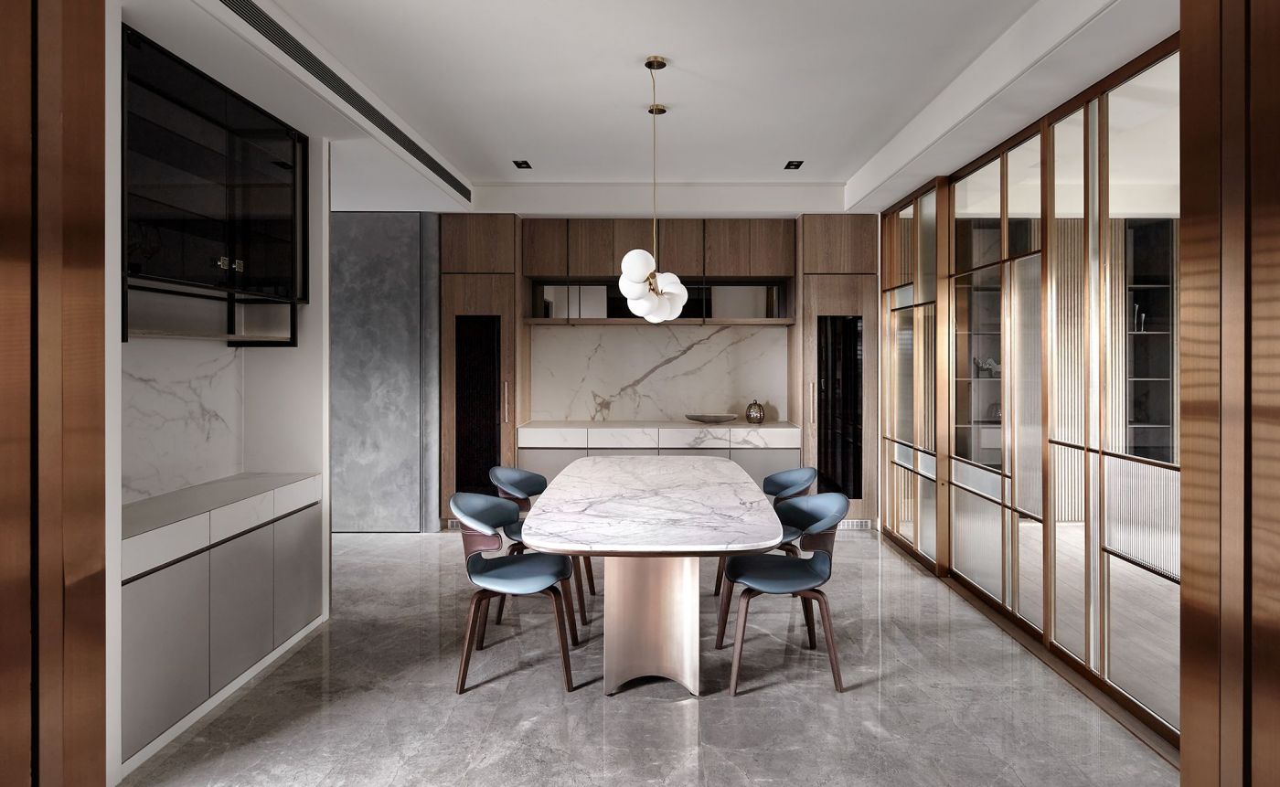那素白的大理石,映照出若有似無的室內點景; 灰色水泥紋牆面與大理石牆對比呼應,呈現霧面與亮面的質感較勁。 帶點藝術及歷史的紋理,在嶄新的空間裡有如沉澱過的遺跡。 家具進駐前的素淨空間裡, 跟孩子一起奔跑律動、輕盈跳躍,好不快活,享受真正的"空"間感。 藍色幾何比例皮板,將視線焦點凝聚在此, 曲折的空間結構,超乎意外地帶來不一樣的空間感受!
