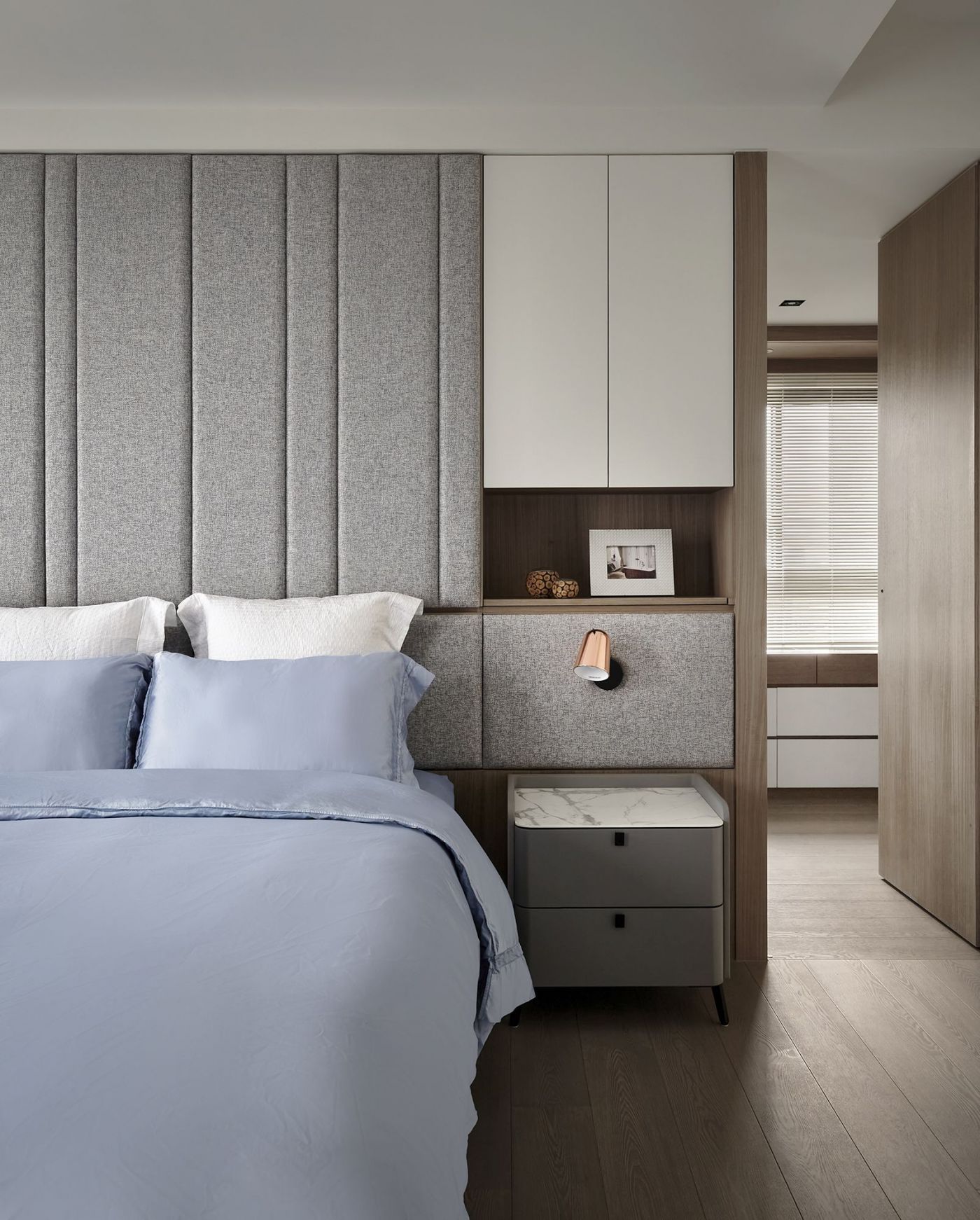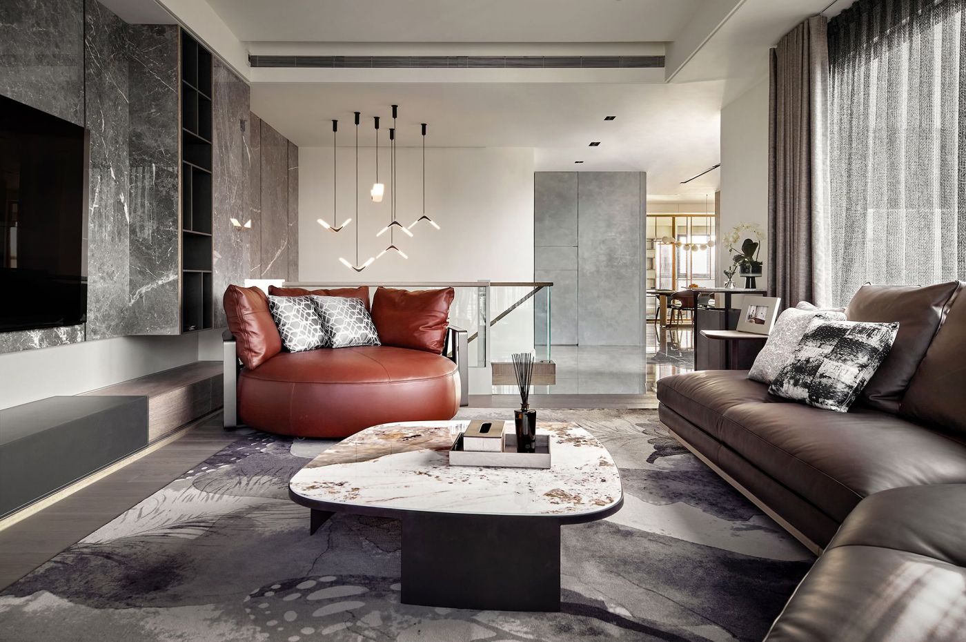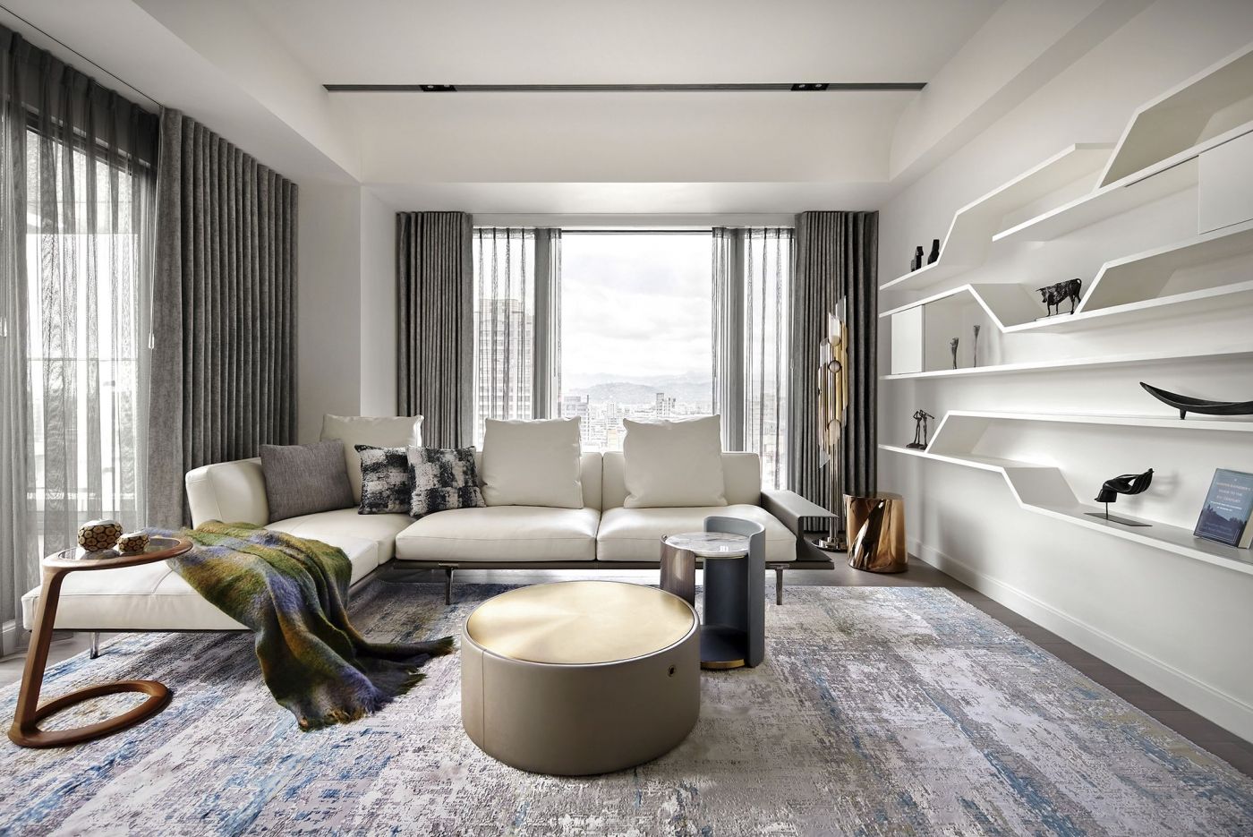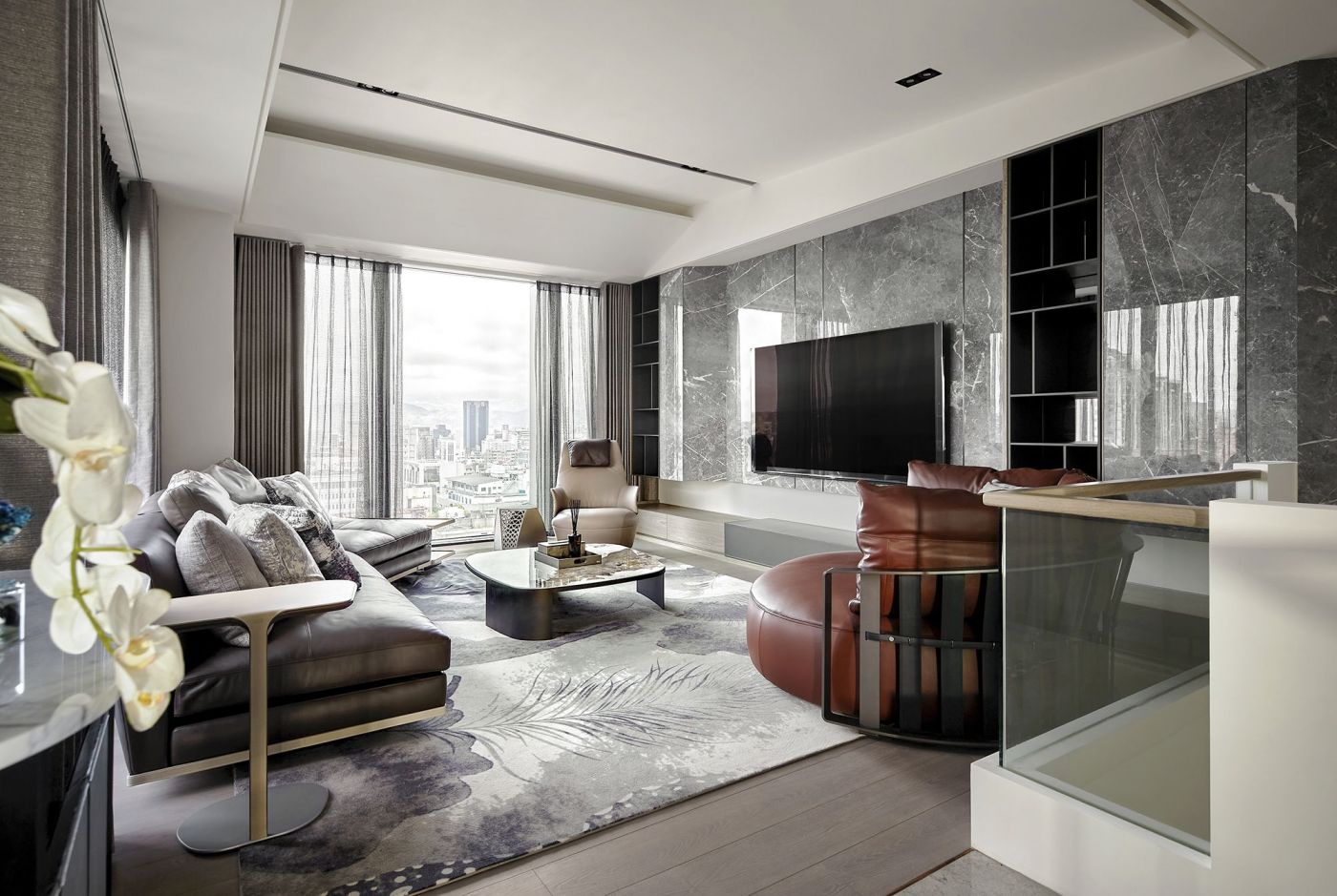 那素白的大理石,映照出若有似無的室內點景; 灰色水泥紋牆面與大理石牆對比呼應,呈現霧面與亮面的質感較勁。 帶點藝術及歷史的紋理,在嶄新的空間裡有如沉澱過的遺跡。 家具進駐前的素淨空間裡, 跟孩子一起奔跑律動、輕盈跳躍,好不快活,享受真正的"空"間感。 藍色幾何比例皮板,將視線焦點凝聚在此, 曲折的空間結構,超乎意外地帶來不一樣的空間感受!