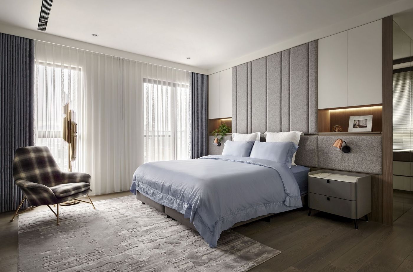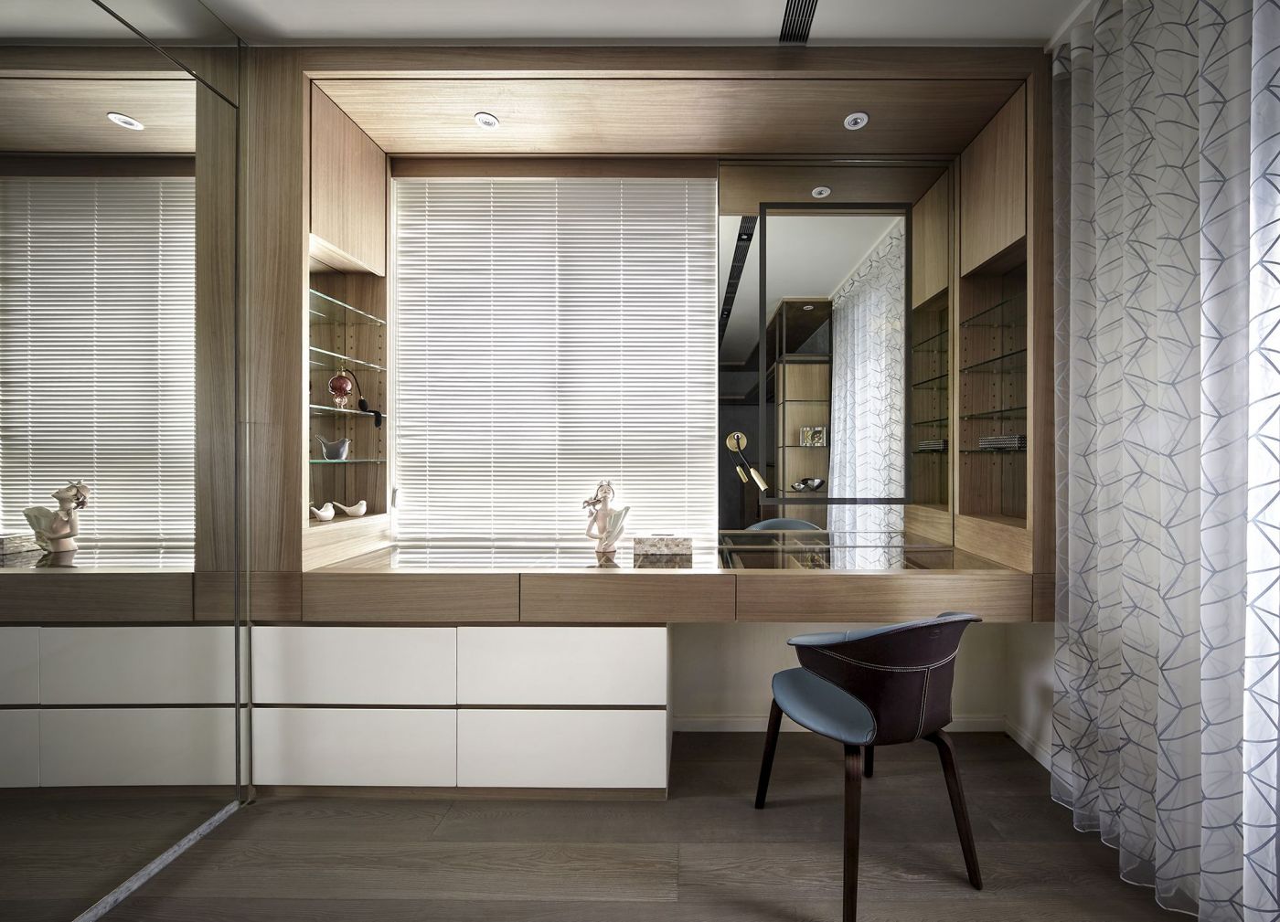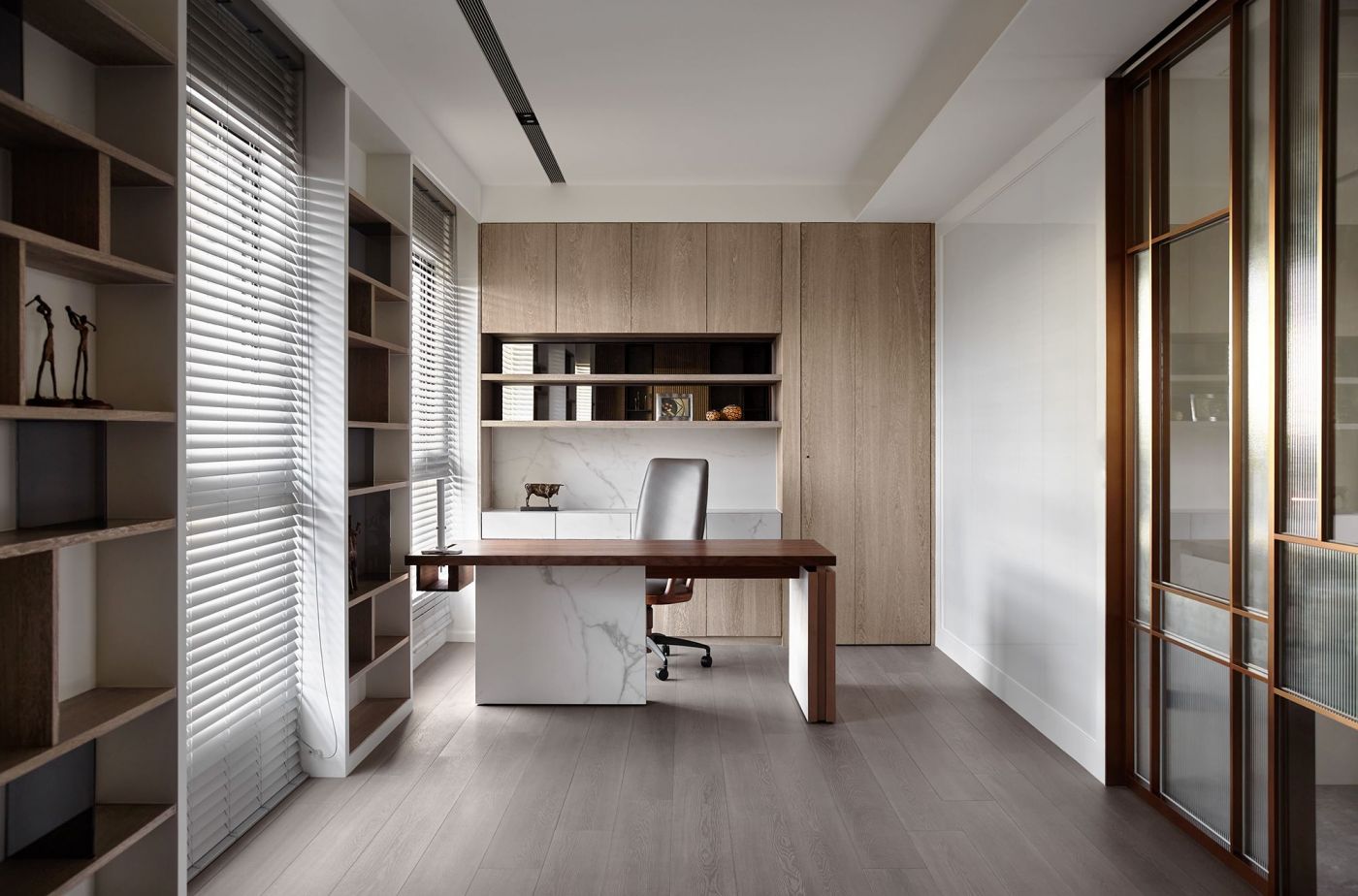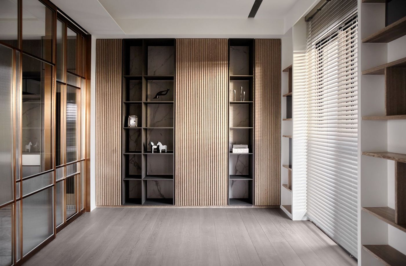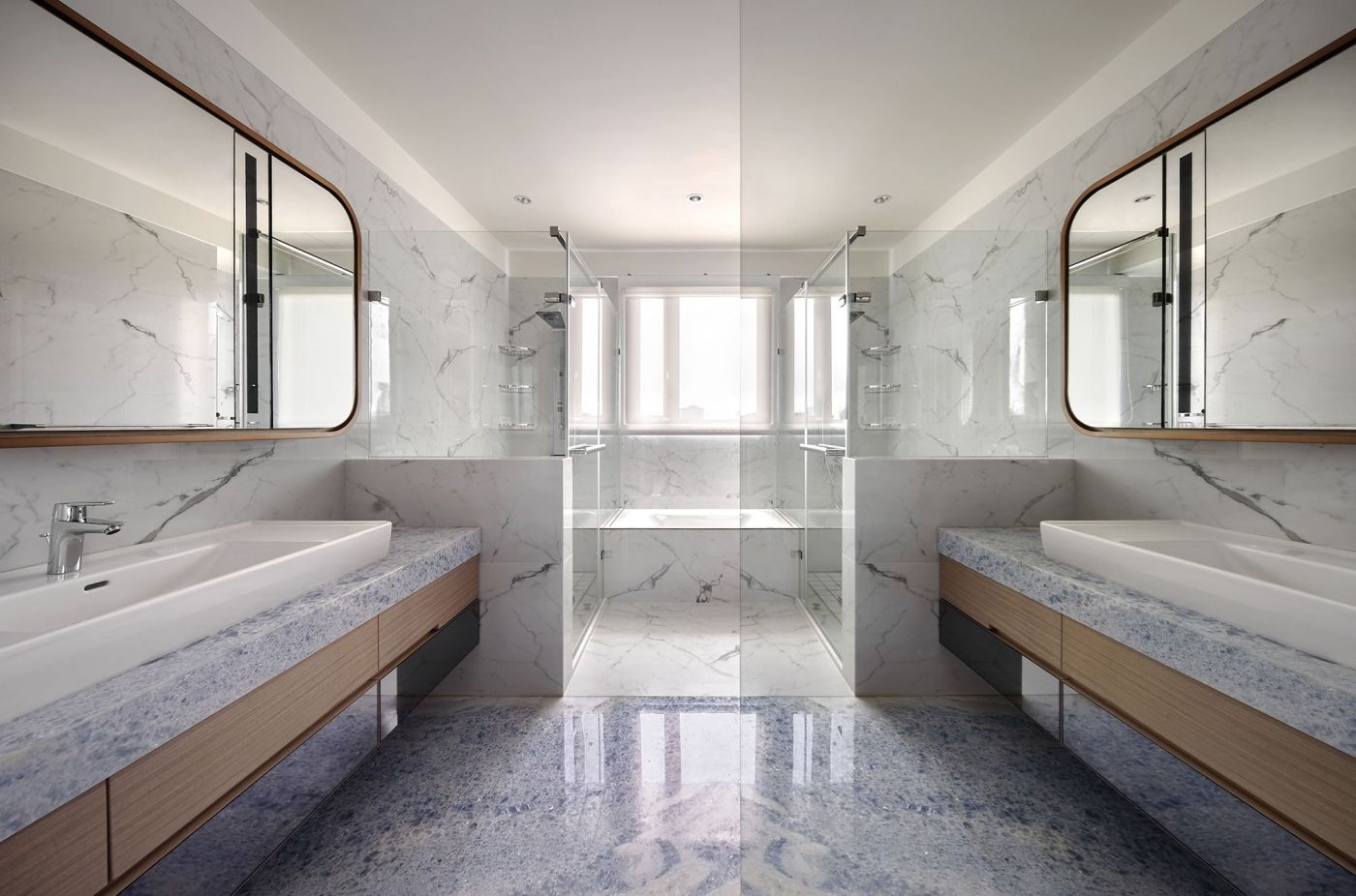 那素白的大理石,映照出若有似無的室內點景; 灰色水泥紋牆面與大理石牆對比呼應,呈現霧面與亮面的質感較勁。 帶點藝術及歷史的紋理,在嶄新的空間裡有如沉澱過的遺跡。 家具進駐前的素淨空間裡, 跟孩子一起奔跑律動、輕盈跳躍,好不快活,享受真正的"空"間感。 藍色幾何比例皮板,將視線焦點凝聚在此, 曲折的空間結構,超乎意外地帶來不一樣的空間感受!