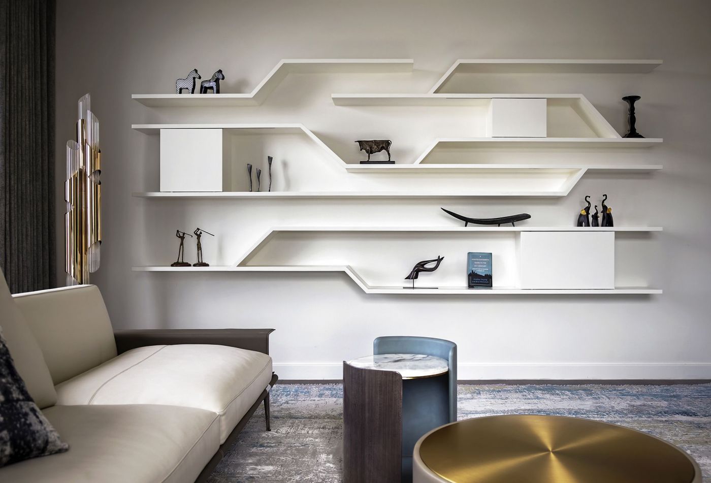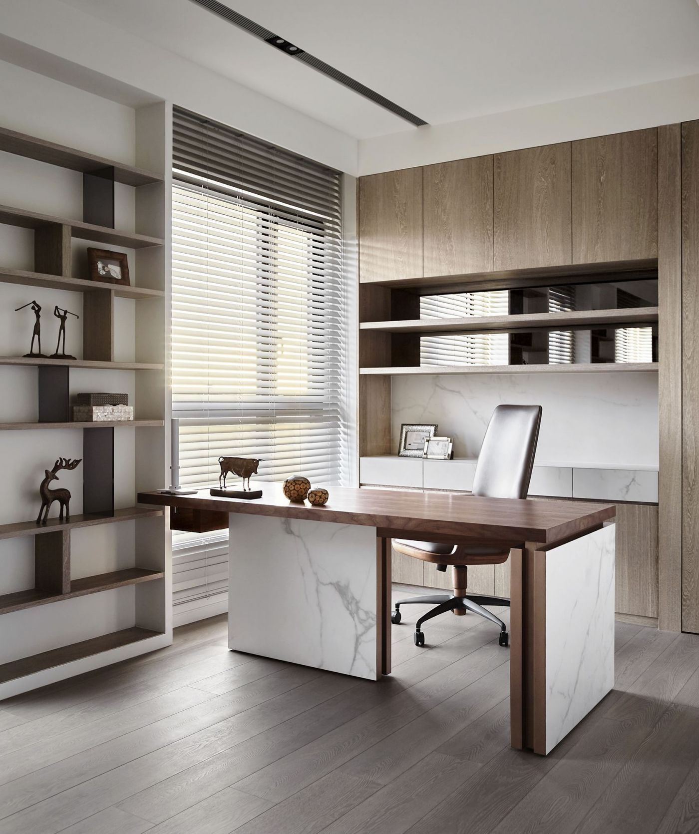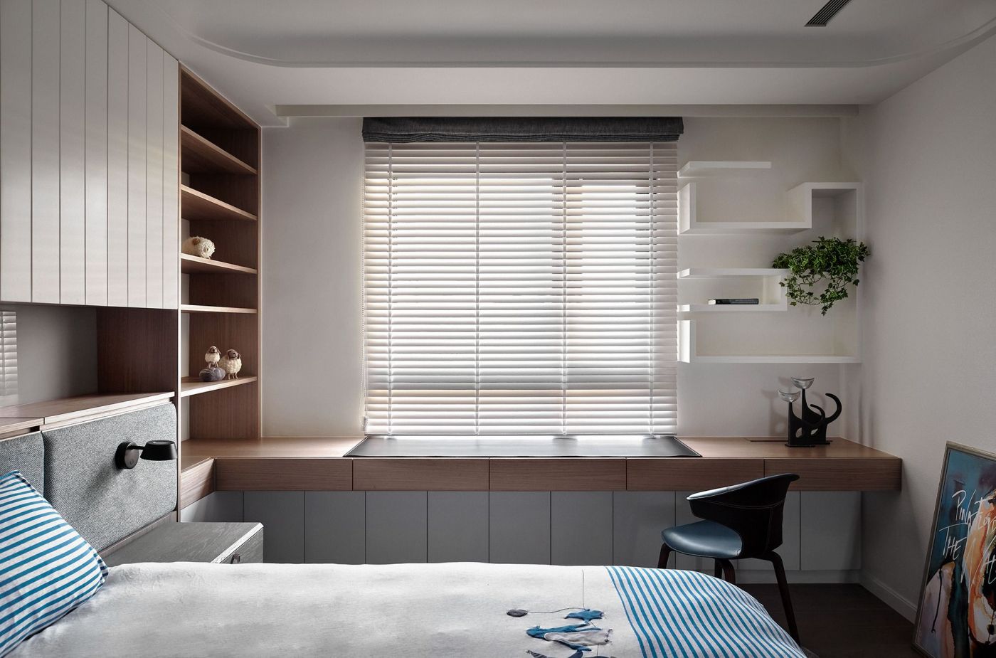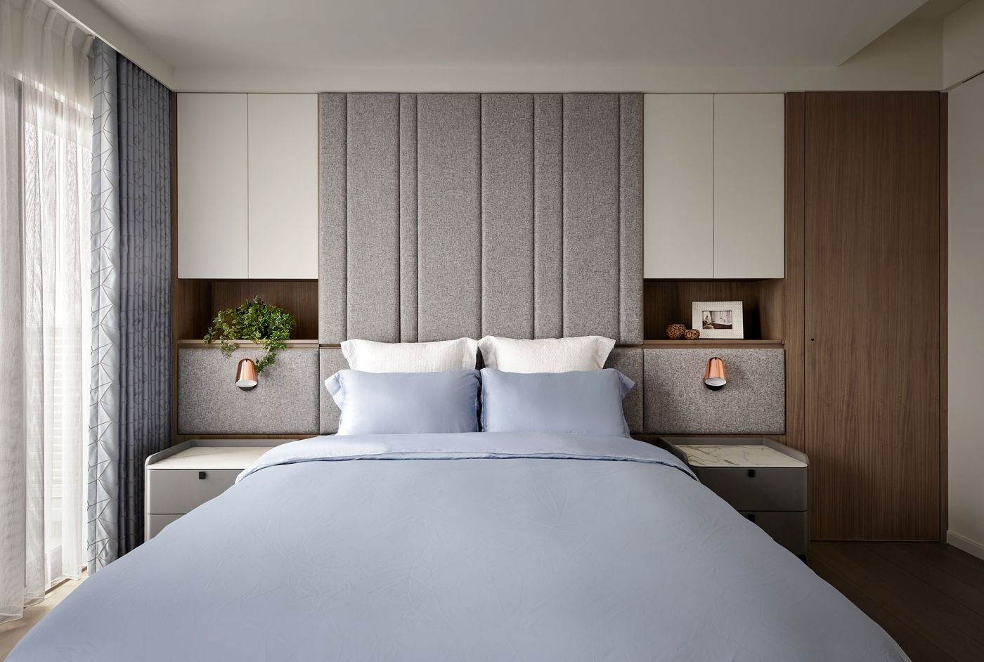 那素白的大理石,映照出若有似無的室內點景; 灰色水泥紋牆面與大理石牆對比呼應,呈現霧面與亮面的質感較勁。 帶點藝術及歷史的紋理,在嶄新的空間裡有如沉澱過的遺跡。 家具進駐前的素淨空間裡, 跟孩子一起奔跑律動、輕盈跳躍,好不快活,享受真正的"空"間感。 藍色幾何比例皮板,將視線焦點凝聚在此, 曲折的空間結構,超乎意外地帶來不一樣的空間感受!